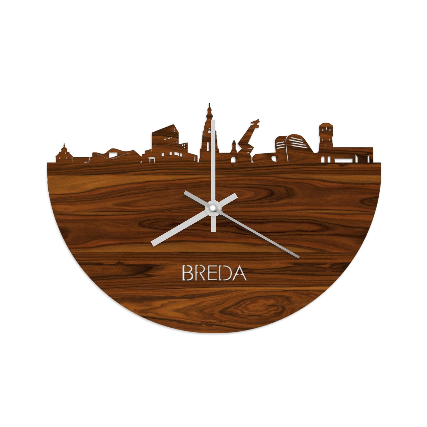 Time flies when you’re having fun! Dat geldt dubbelop als je deze multifunctionele houten wandklok van WoodWideCities in huis haalt. Deze klok met afbeelding van de skyline van Breda houdt je bij de tijd, maar neemt je ook mee terug naar de stad waar je bent geboren of waar je hebt gestudeerd. Een mooie herinnering, elke keer als je kijkt hoe laat het is! Of wat dacht je van een afscheidscadeau, een tijdloos geschenk voor moeder- of vaderdag en andere mijlpalen zoals trouwerijen, het behalen van diploma’s en het openen van een nieuw kantoor of bedrijf, een spetterende binnenkomer voor je kind die gaat studeren in een andere stad of een ideaal cadeau voor de housewarming van kennissen en vrienden.