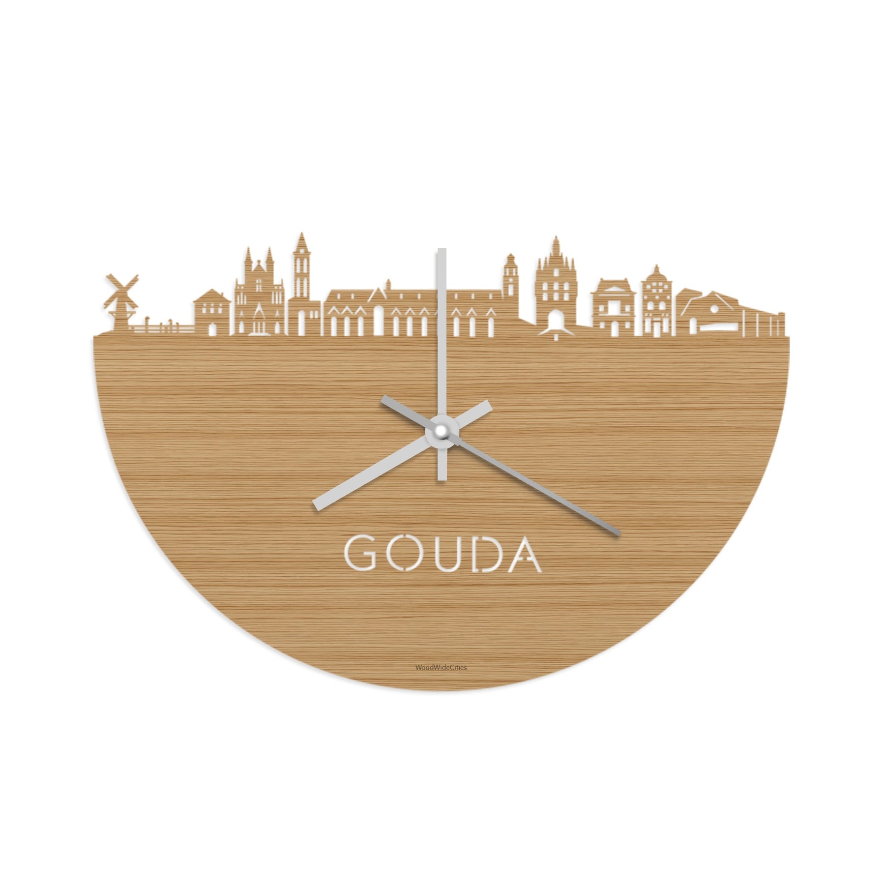 Time flies when you’re having fun! Dat geldt dubbelop als je deze multifunctionele houten wandklok van WoodWideCities in huis haalt. Deze klok met afbeelding van de skyline van Gouda houdt je bij de tijd, maar neemt je ook mee terug naar de stad waar je bent geboren of waar je hebt gestudeerd. Een mooie herinnering, elke keer als je kijkt hoe laat het is! Of wat dacht je van een afscheidscadeau, een tijdloos geschenk voor moeder- of vaderdag en andere mijlpalen zoals trouwerijen, het behalen van diploma’s en het openen van een nieuw kantoor of bedrijf, een spetterende binnenkomer voor je kind die gaat studeren in een andere stad of een ideaal cadeau voor de housewarming van kennissen en vrienden.