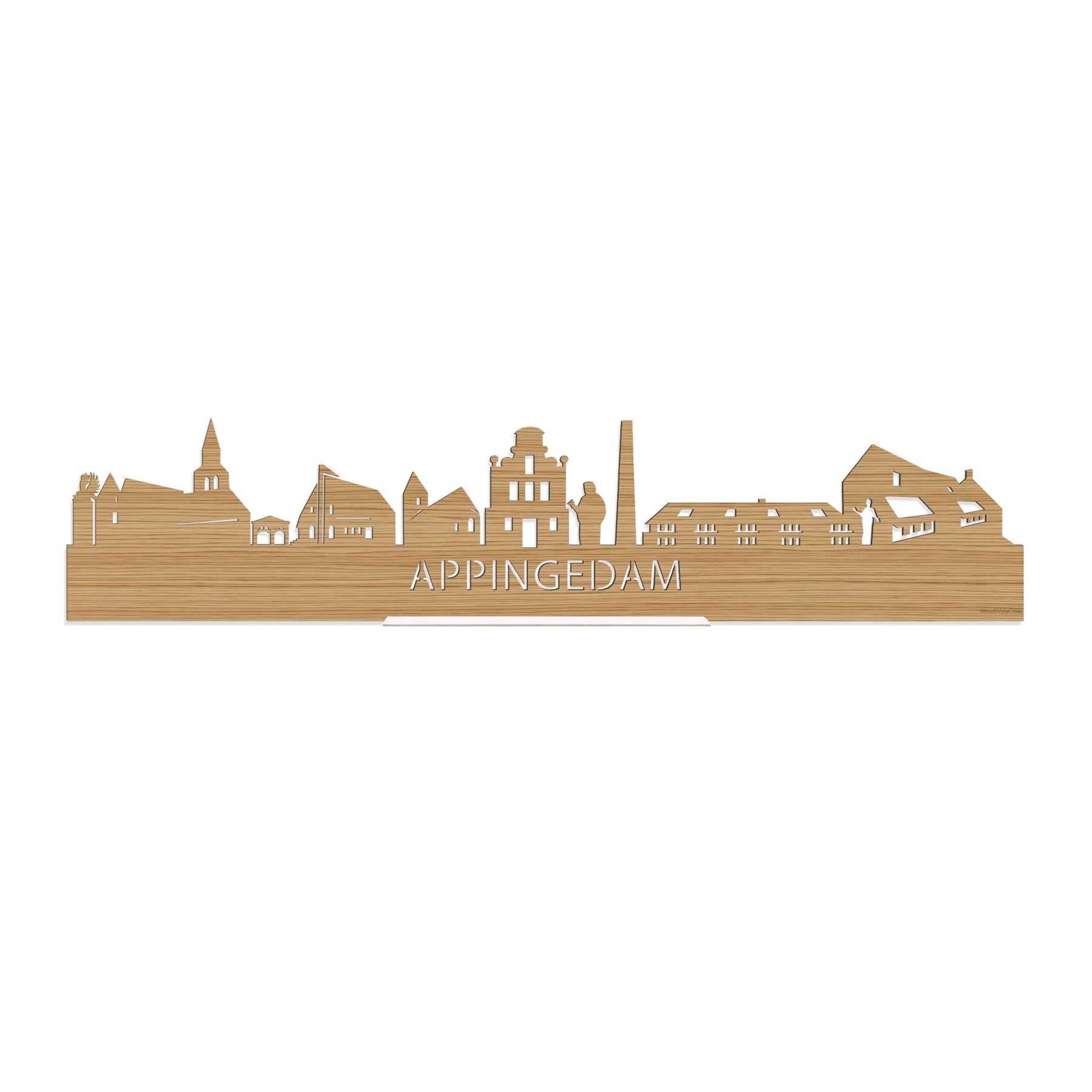 Je herkent ze vast allemaal; de hoogtepunten van deze geliefde plaats: Pelikaan (stadswapen Appingedam), Nicolaïkerk, De koepel, Gereformeerde Kerk Vrijgemaakt, Kerk Marsum, Raadhuis Appingedam, Stadsomroeper, De Eendracht, Willem Lodewijk van Nassau kazerne, Beeld Professor Cleveringa . De skyline is gemaakt in samenwerking met Appingedam ondernemers en het silhouet komt uit het creatieve brein van een architect, dus alle verhoudingen kloppen.