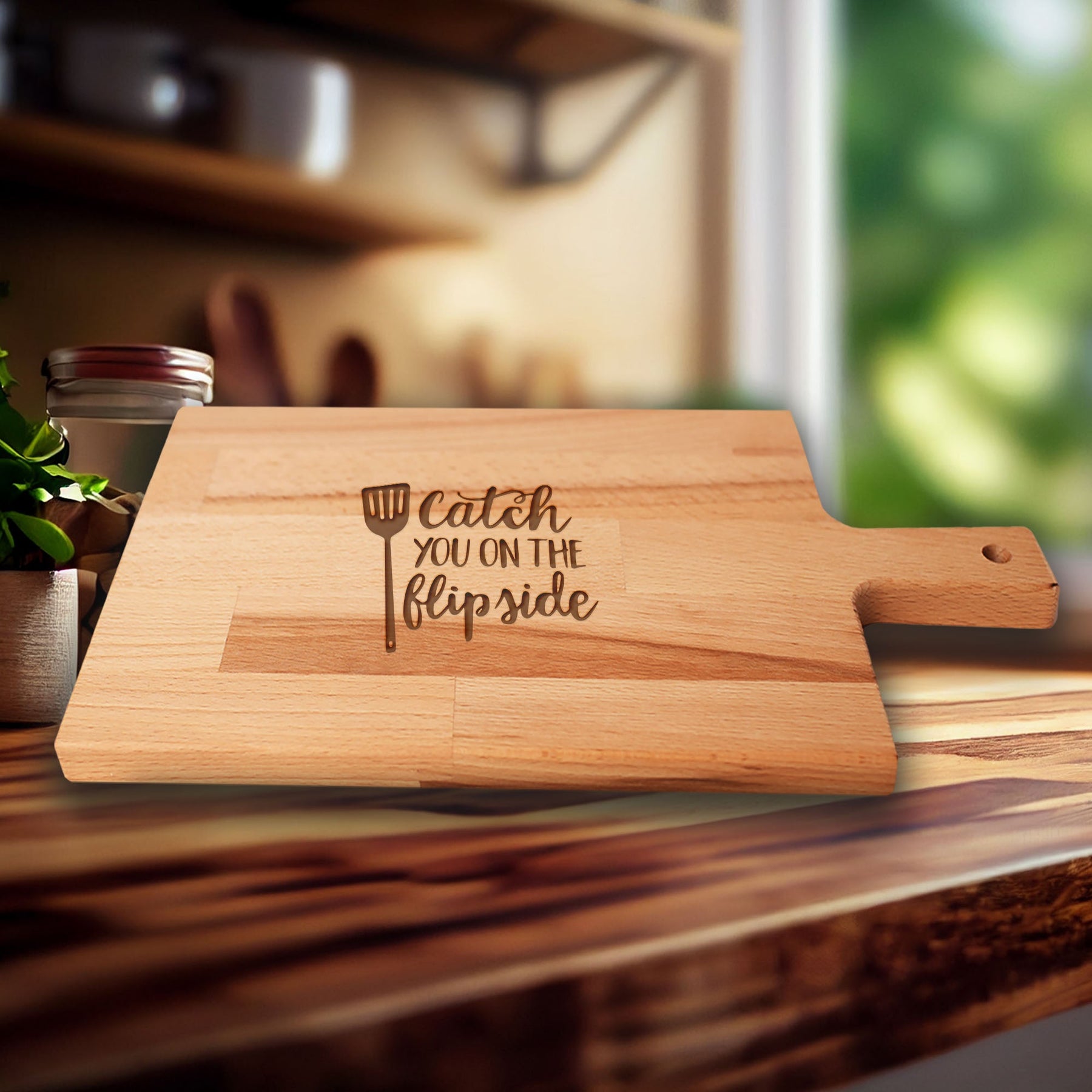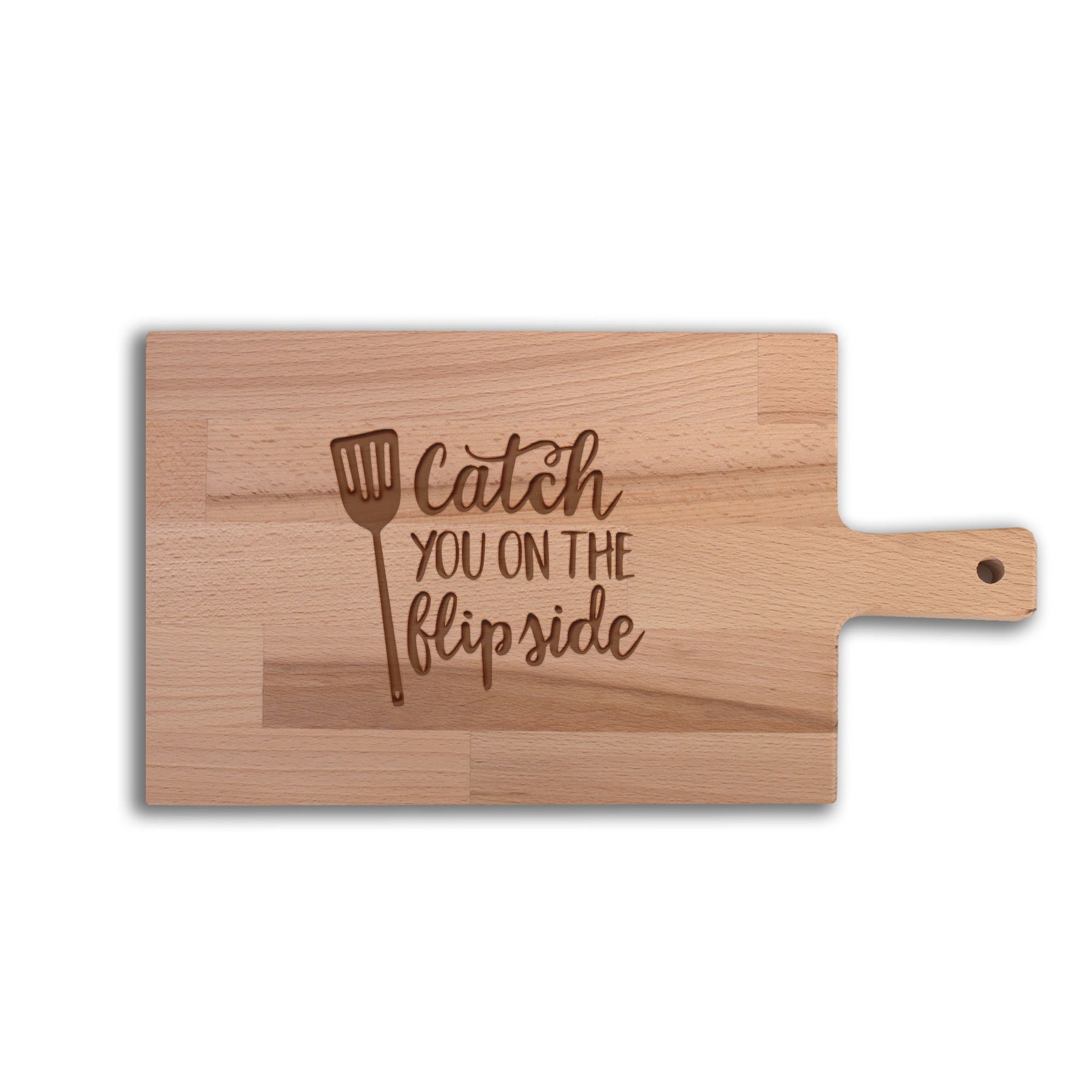 Deze prachtige serveerplank is het perfecte cadeau voor elke gelegenheid! Met de inspirerende tekst "Catch You on the Flipside" gegraveerd in het hout, voegt deze plank een persoonlijk tintje toe aan elke keuken of eettafel. Gemaakt van hoogwaardig materiaal en met een unieke, moderne uitstraling, is deze serveerplank niet alleen stijlvol, maar ook praktisch en duurzaam. Of het nu gaat om een housewarming, verjaardag of gewoon als een speciaal geschenk voor een geliefde, deze serveerplank is de perfecte keuze voor elke gelegenheid.