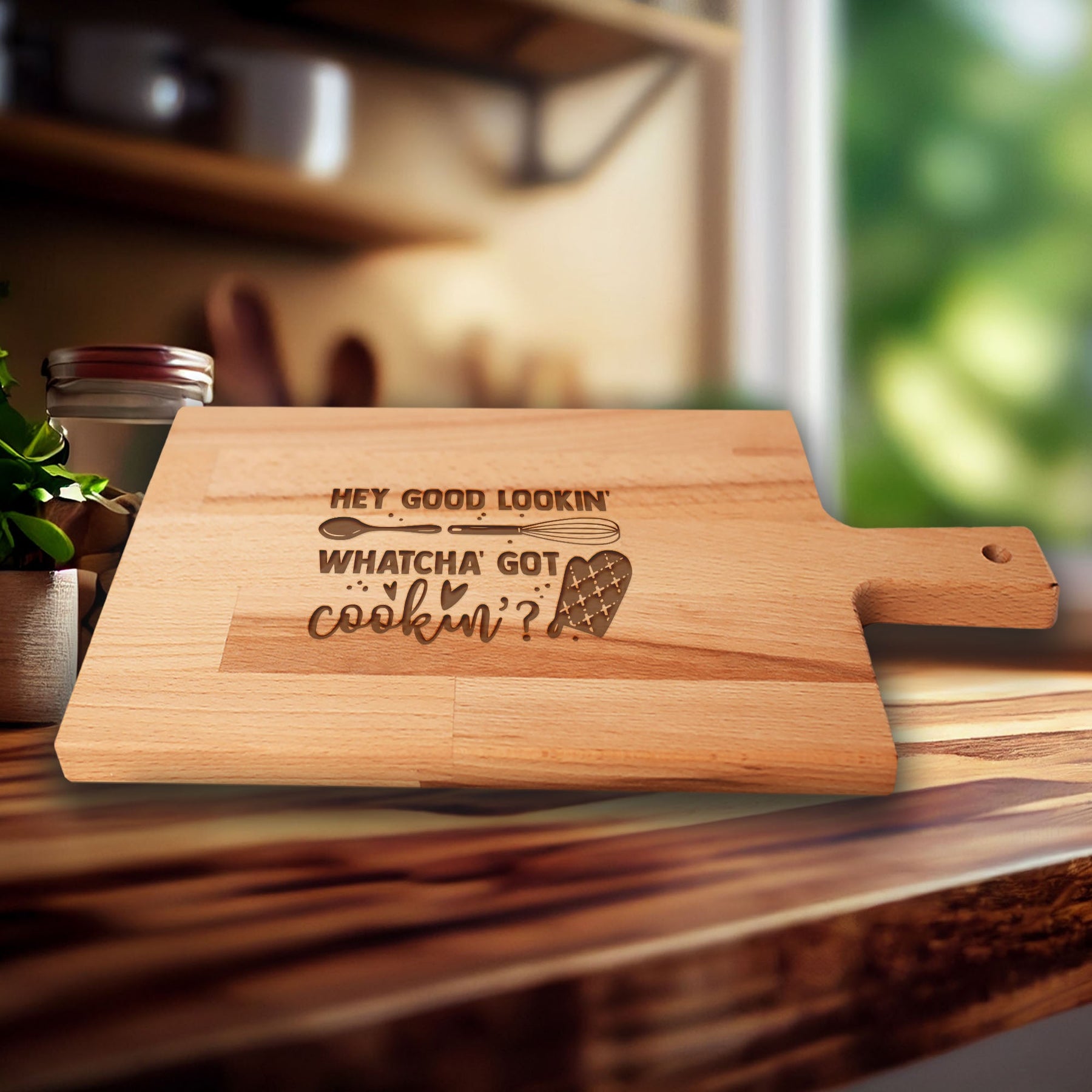 Deze prachtige serveerplank is het perfecte cadeau voor de keukenprins of -prinses in jouw leven. De plank is gemaakt van hoogwaardig hout en heeft de tekst "Hey Good Lookin Watcha Got Cookin" erin gegraveerd, wat zorgt voor een speelse en persoonlijke touch. Of het nu gaat om het serveren van hapjes op een feestje of het presenteren van een heerlijke maaltijd tijdens een intiem diner, deze serveerplank zal zeker de show stelen. Bovendien is het een duurzaam cadeau dat jarenlang gebruikt kan worden en herinneringen oproept aan bijzondere momenten in de keuken.