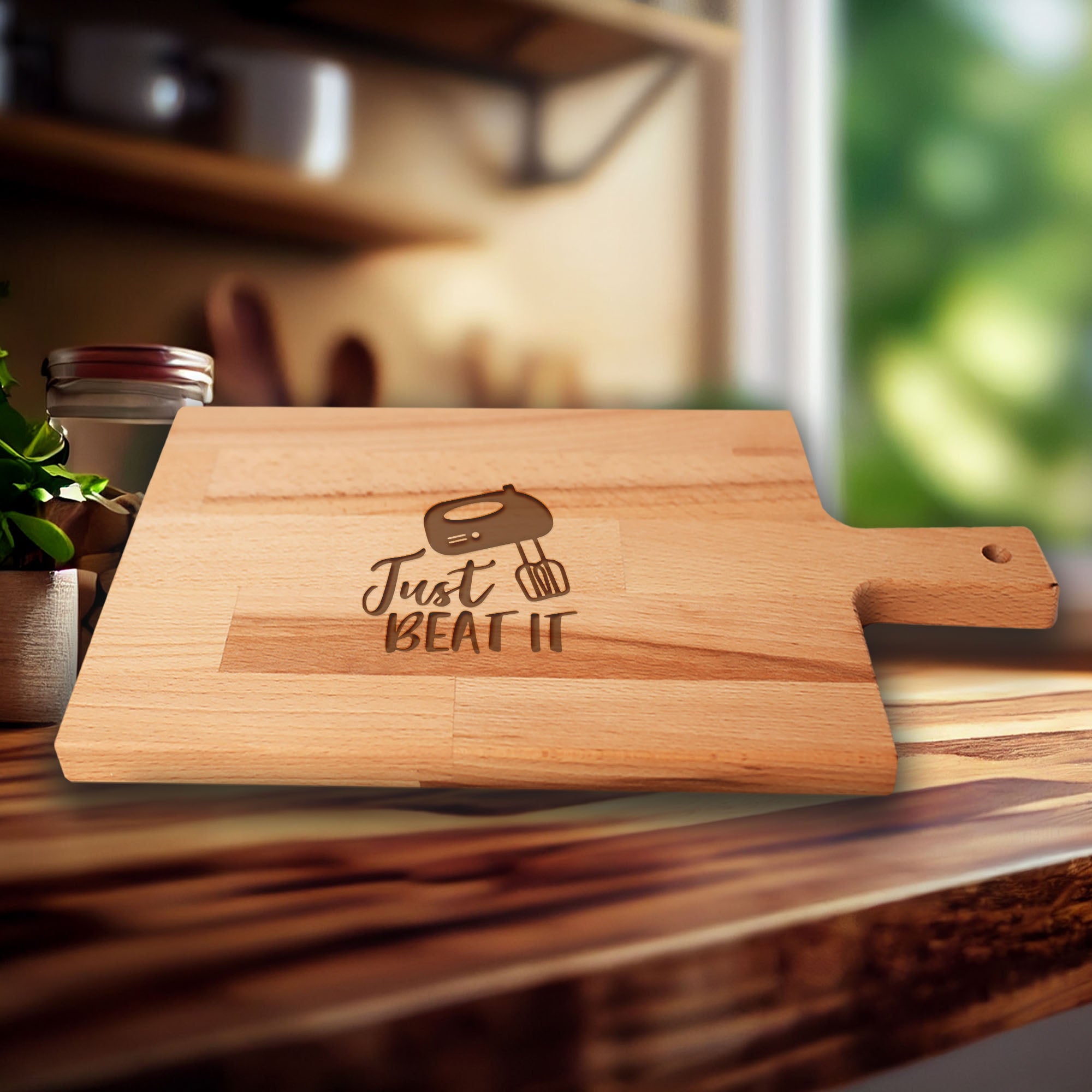 Deze stijlvolle serveerplank is het perfecte cadeau voor de kok of bakker in jouw leven! Met de tekst "Just Beat It" gegraveerd op het oppervlak van de plank, is het een geweldige manier om iemand te feliciteren met hun culinaire vaardigheden. Gemaakt van hoogwaardig hout en met een gladde afwerking, is deze plank perfect voor het presenteren van hapjes, brood en kaas, of het serveren van een heerlijk stukje taart. Het is een uniek cadeau-idee dat zeker in de smaak zal vallen bij elke liefhebber van koken en bakken.