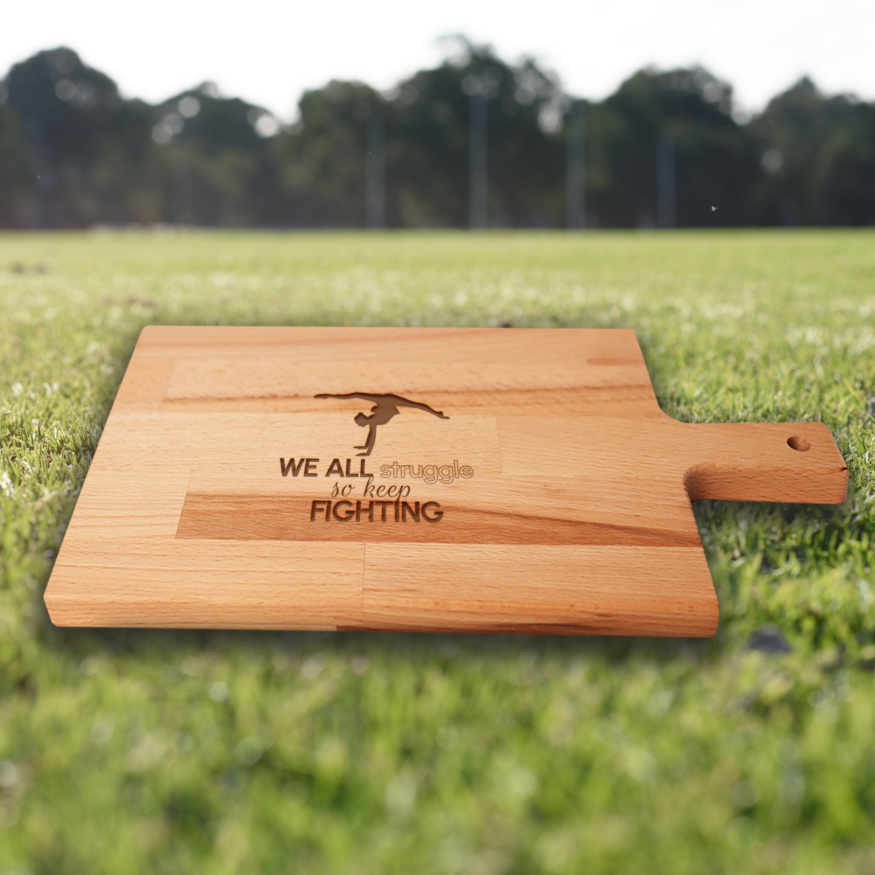 Serveerplank Gymnastiek (Vrouw) We All Struggle So Keep Fighting houten cadeau decoratie relatiegeschenk van WoodWideCities