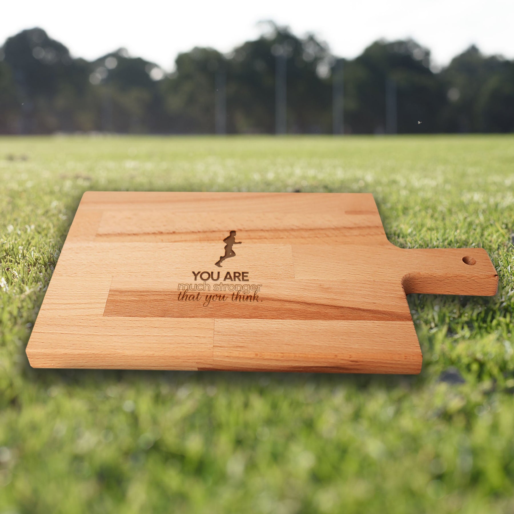 Deze sport serveerplank is niet alleen mooi en duurzaam, maar ook handgemaakt in Nederland. Op zoek naar een cadeau voor een hardlopen (man) liefhebber? Dan is deze serveerplank met een prachtig hardlopen (man) illustratie en tekst You Are Much Stronger Than You Think gravure, het perfecte cadeau!
