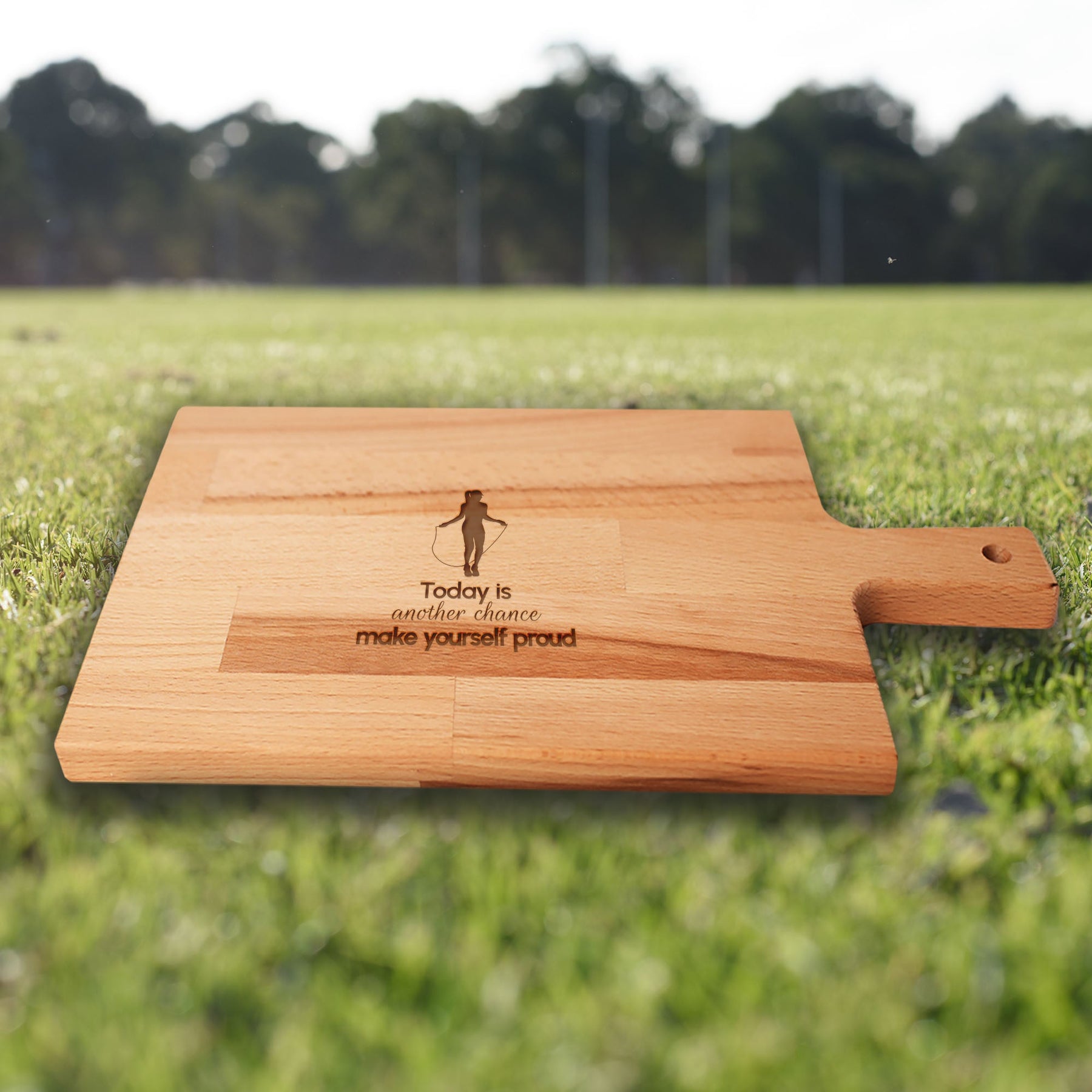 Deze sport serveerplank is niet alleen mooi en duurzaam, maar ook handgemaakt in Nederland. Op zoek naar een cadeau voor een touwtje springen (vrouw) liefhebber? Dan is deze serveerplank met een prachtig touwtje springen (vrouw) illustratie en tekst Today Is Another Chance Make Yourself Proud gravure, het perfecte cadeau!