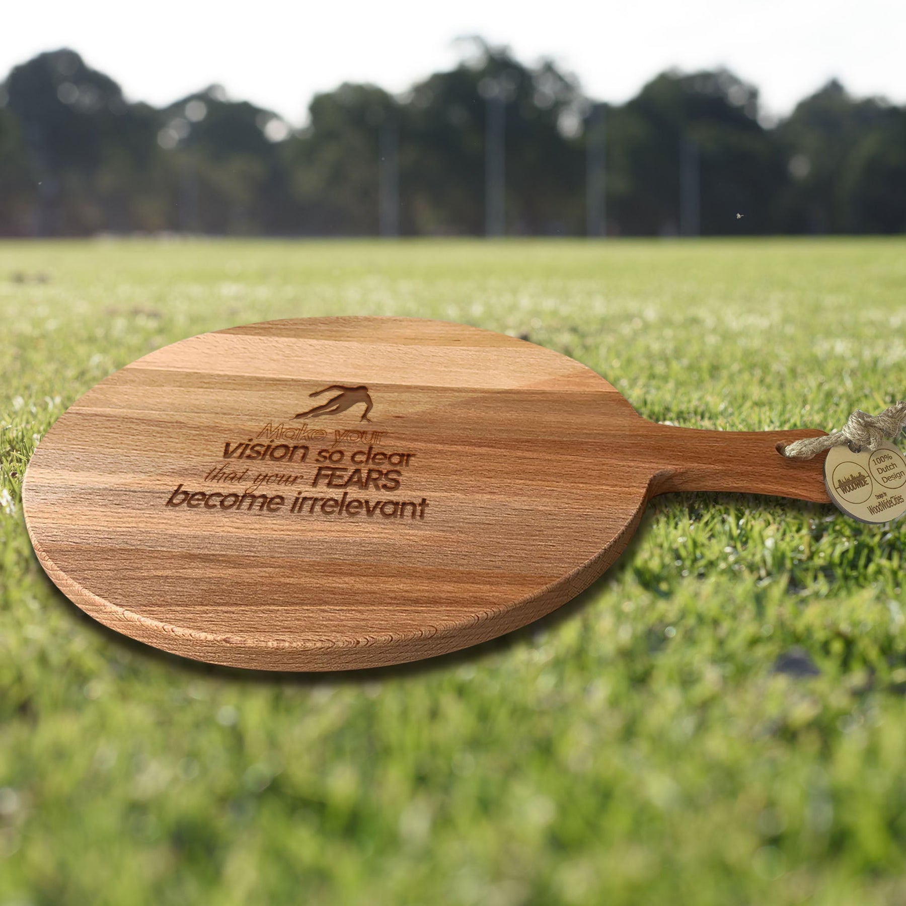 DDeze sport serveerplank is niet alleen mooi en duurzaam, maar ook handgemaakt in Nederland. Op zoek naar een cadeau voor een schaatsen liefhebber? Dan is deze serveerplank met een prachtig schaatsen illustratie en tekst Make Your Vision So Clear That Your Fears Become Irrelevant gravure, het perfecte cadeau!