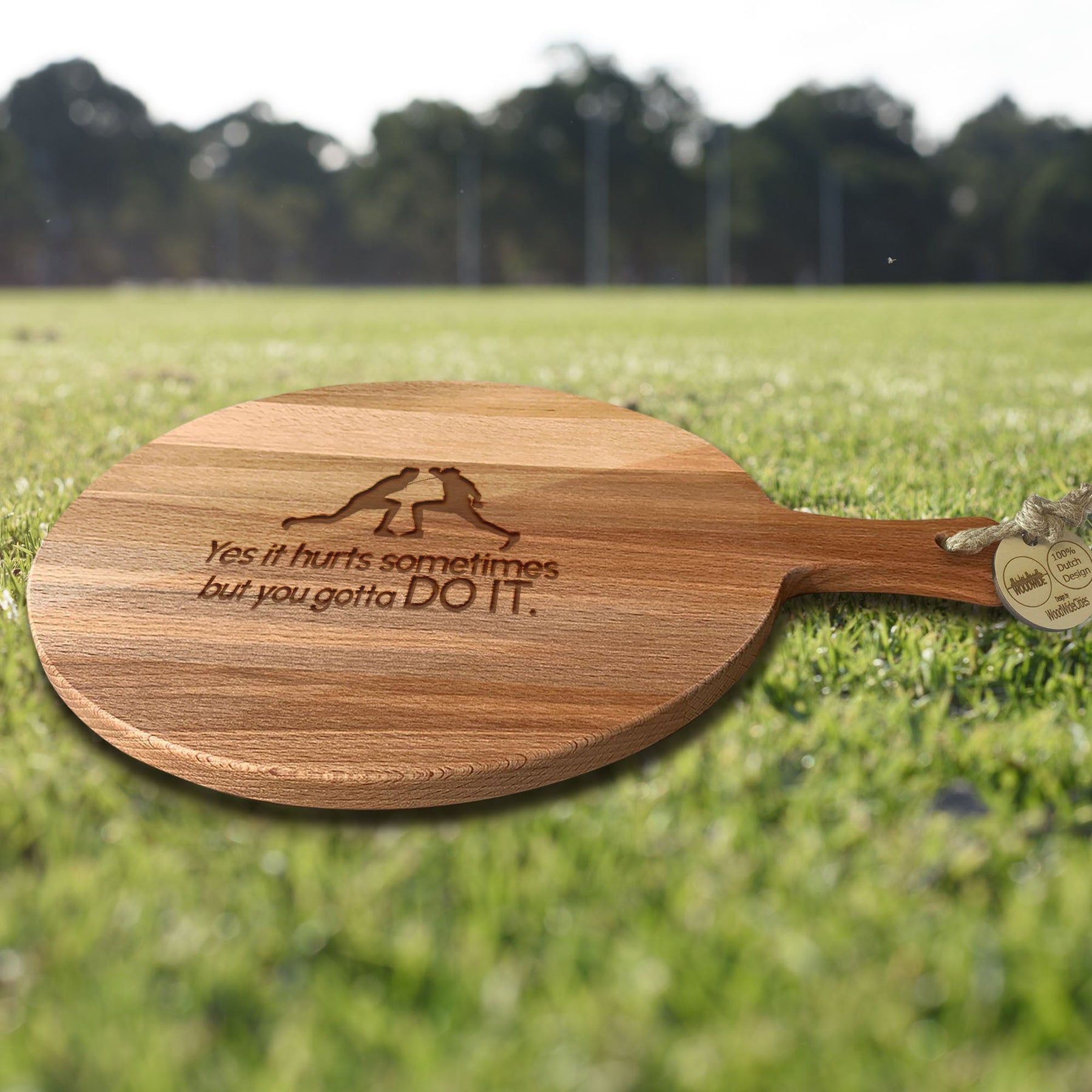 DDeze sport serveerplank is niet alleen mooi en duurzaam, maar ook handgemaakt in Nederland. Op zoek naar een cadeau voor een schermen liefhebber? Dan is deze serveerplank met een prachtig schermen illustratie en tekst Yes It Hurts Sometimes But You Gotta DO IT gravure, het perfecte cadeau!