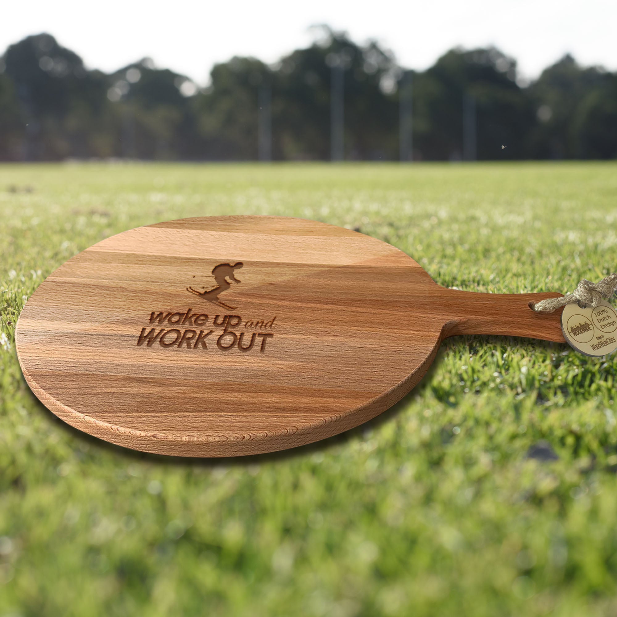 DDeze sport serveerplank is niet alleen mooi en duurzaam, maar ook handgemaakt in Nederland. Op zoek naar een cadeau voor een skiën liefhebber? Dan is deze serveerplank met een prachtig skiën illustratie en tekst Wake Up and Work Out gravure, het perfecte cadeau!