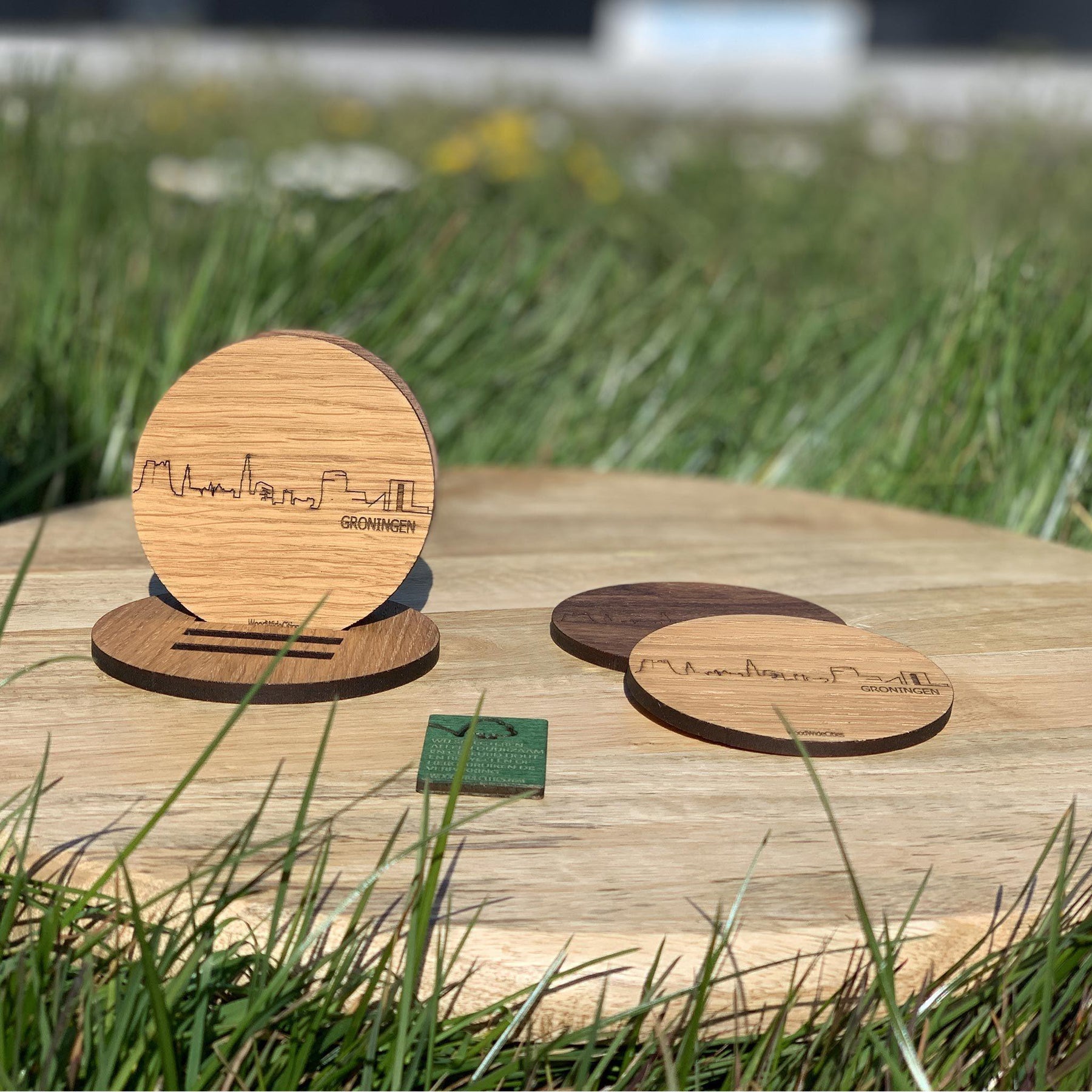 Met de Skyline Onderzetters Groningen leuk je de koffietafel op. Of je eettafel, bureau of dat leuke bijzettafeltje natuurlijk. De onderzetters van WoodWideCities zijn gelaserd uit hout waarop jouw stadje centraal staat. Wij graveren de skyline van Groningen met precisie in je pronkstuk. Om het geheel af te maken bewerken wij de onderzetters met een speciale olie voor een prachtige afwerking.