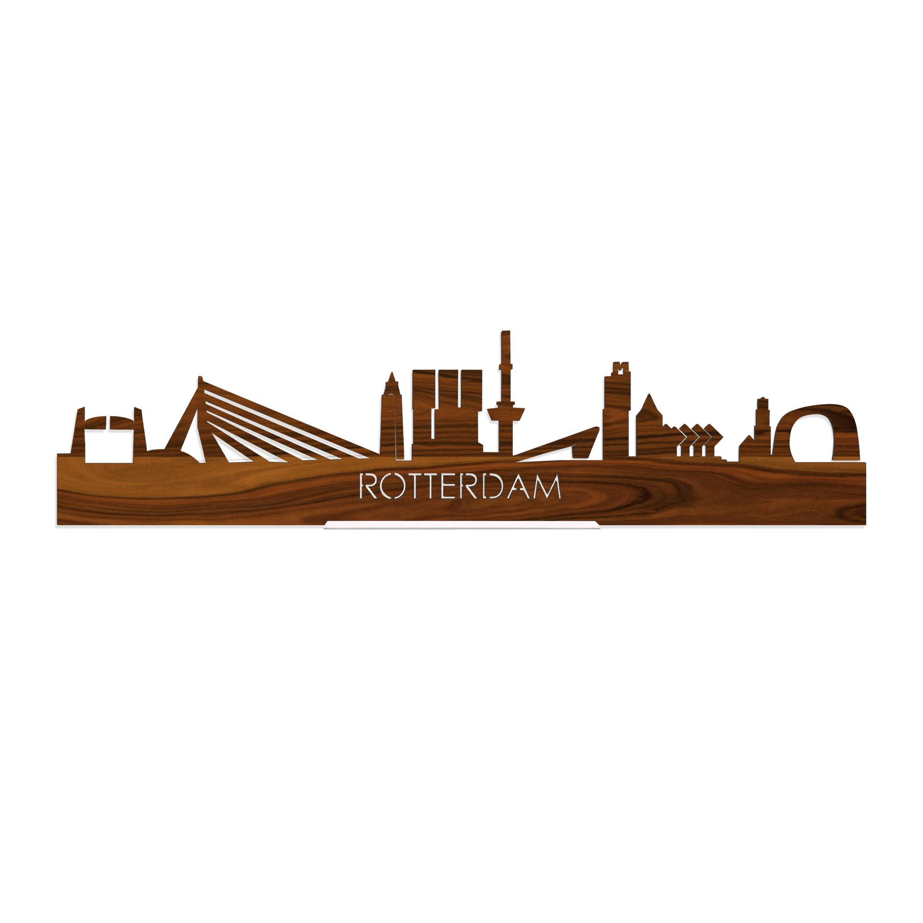 De skyline van Rotterdam is verkrijgbaar in verschillende soorten hout: zwart mdf, eiken, noten en palissander. De houtsoorten zijn duurzaam, ecologisch en gekeurd. Dat vinden wij belangrijk! Bij het produceren van houten decoraties komen geen schadelijke stoffen vrij, hout gaat langer mee en het is biologisch afbreekbaar. Daarnaast is de houten afwerking bij elke skyline anders. Dat maakt jouw skyline uniek!