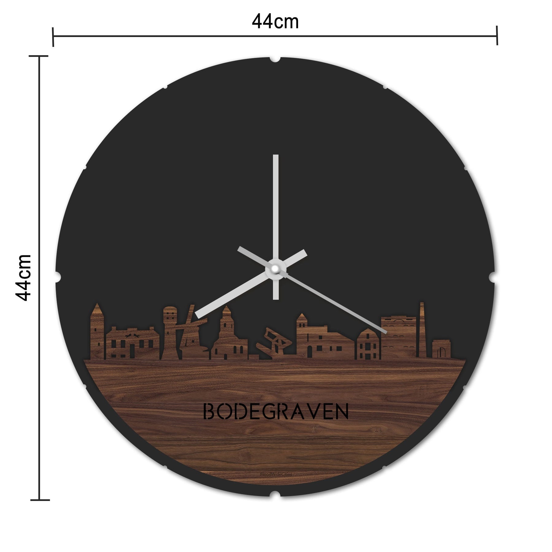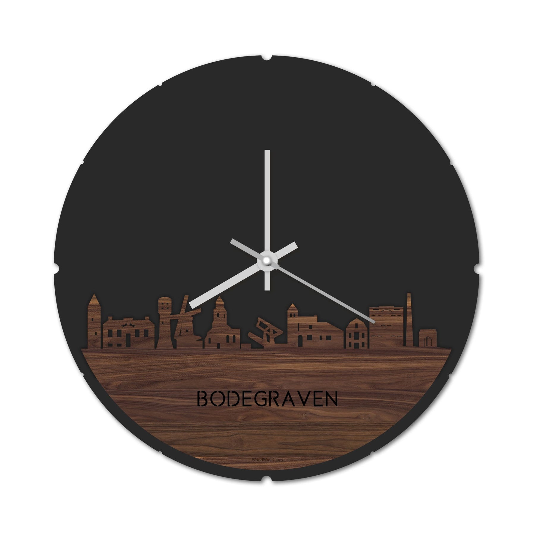 Blijf bij de tijd met de ronde skyline wandklok Dat geldt dubbelop als je deze multifunctionele houten Skyline Klok Rond Bodegraven Noten in huis haalt. Deze klok met de skyline van Bodegraven houdt je bij de tijd, maar neemt je ook mee terug naar de stad waar je bent geboren of waar je hebt gestudeerd. Een mooie herinnering, elke keer als je kijkt hoe laat het is! Of wat dacht je van een afscheidscadeau, een tijdloos geschenk voor moeder- of vaderdag en andere mijlpalen zoals trouwerijen, het behalen van diploma’s en het openen van een nieuw kantoor of bedrijf, een spetterende binnenkomer voor je kind die gaat studeren in een andere stad of een ideaal cadeau voor de housewarming van kennissen en vrienden.