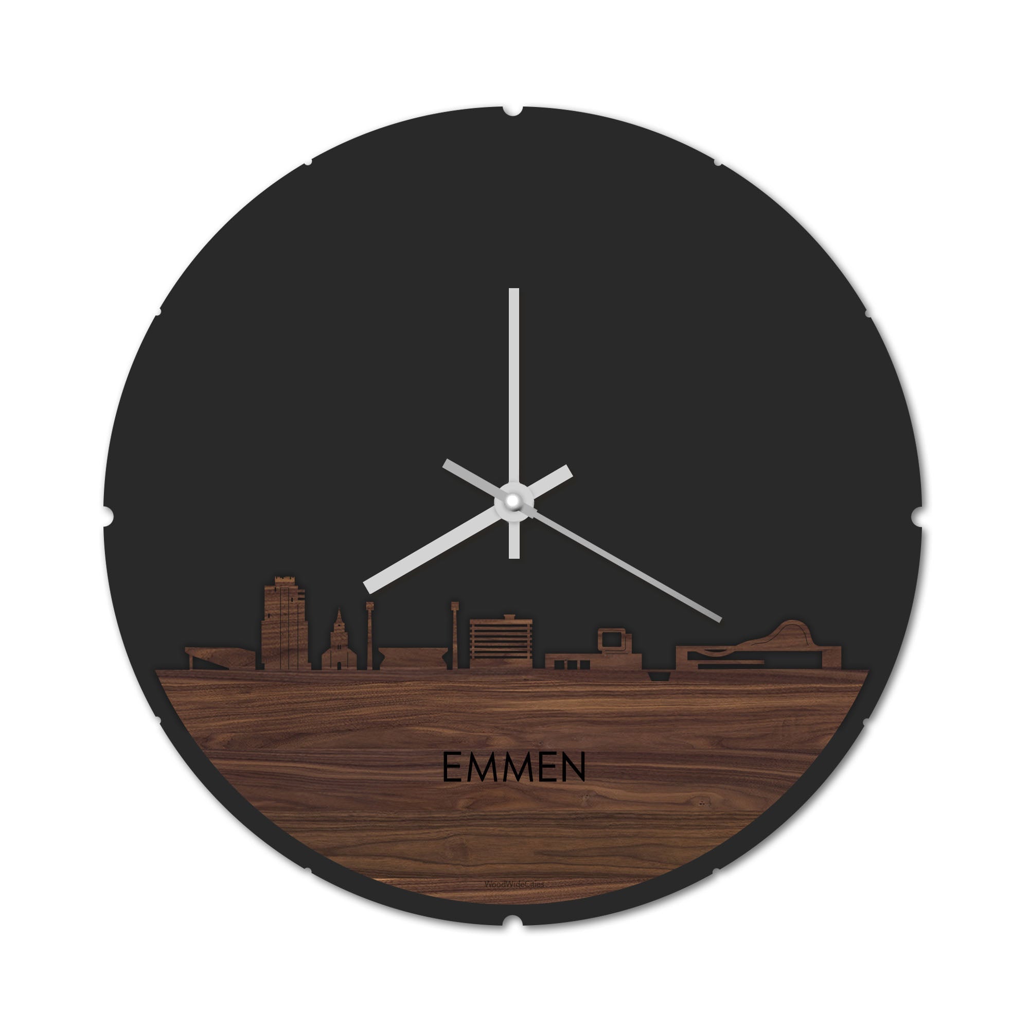 Skyline Klok Rond Emmen Noten Noten houten cadeau decoratie relatiegeschenk van WoodWideCities