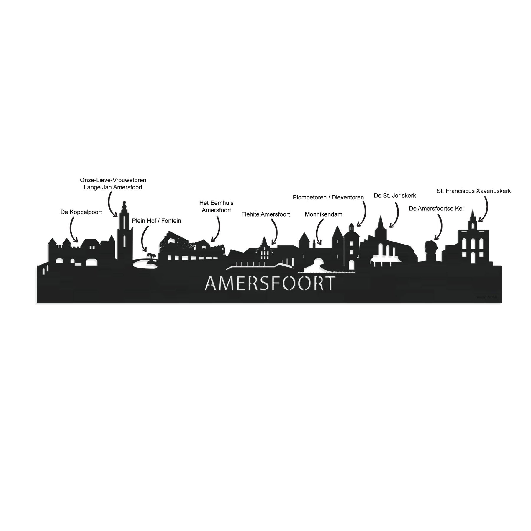 Je herkent ze vast allemaal: De Koppelpoort, Onze-Lieve-Vrouwentoren / Lange Jan, Plein Hof / Fontein, Het Eemhuis Amersfoort, Flehite, Monnikendam, Plompetoren / Dieventoren Amersfoort, De St. Joriskerk, De Amersfoortse Kei en St. Franciscus Xaveriuskerk. De skyline is gemaakt in samenwerking met Amersfoort ondernemers en het silhouet komt uit het creatieve brein van een architect, dus alle verhoudingen kloppen.