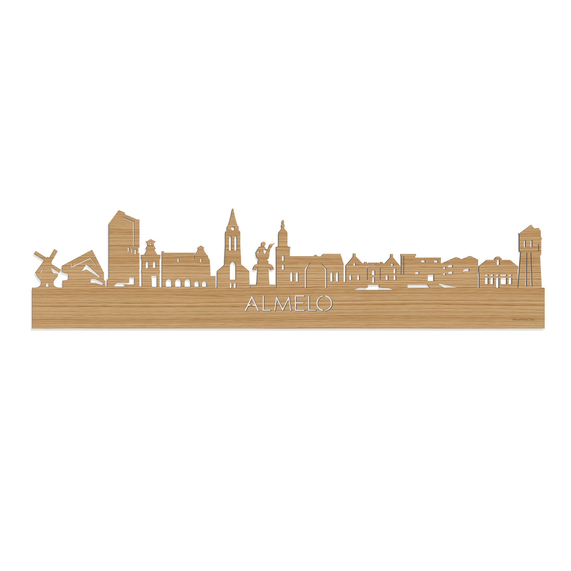Je herkent ze vast allemaal; de hoogtepunten van deze geliefde plaats: Korenmolen de Hoop, De Groundscraper, Javatoren, Kunst-Torentje, Voormalig Waaggebouw, Sint-Georgiusbasiliek, Jongetje op gans, Grote Kerk Almelo, Huize Almelo, Theaterhotel Almelo, Bolletje Winkel en De Betonnen Watertoren. De skyline is gemaakt in samenwerking met Almelo ondernemers en het silhouet komt uit het creatieve brein van een architect, dus alle verhoudingen kloppen.