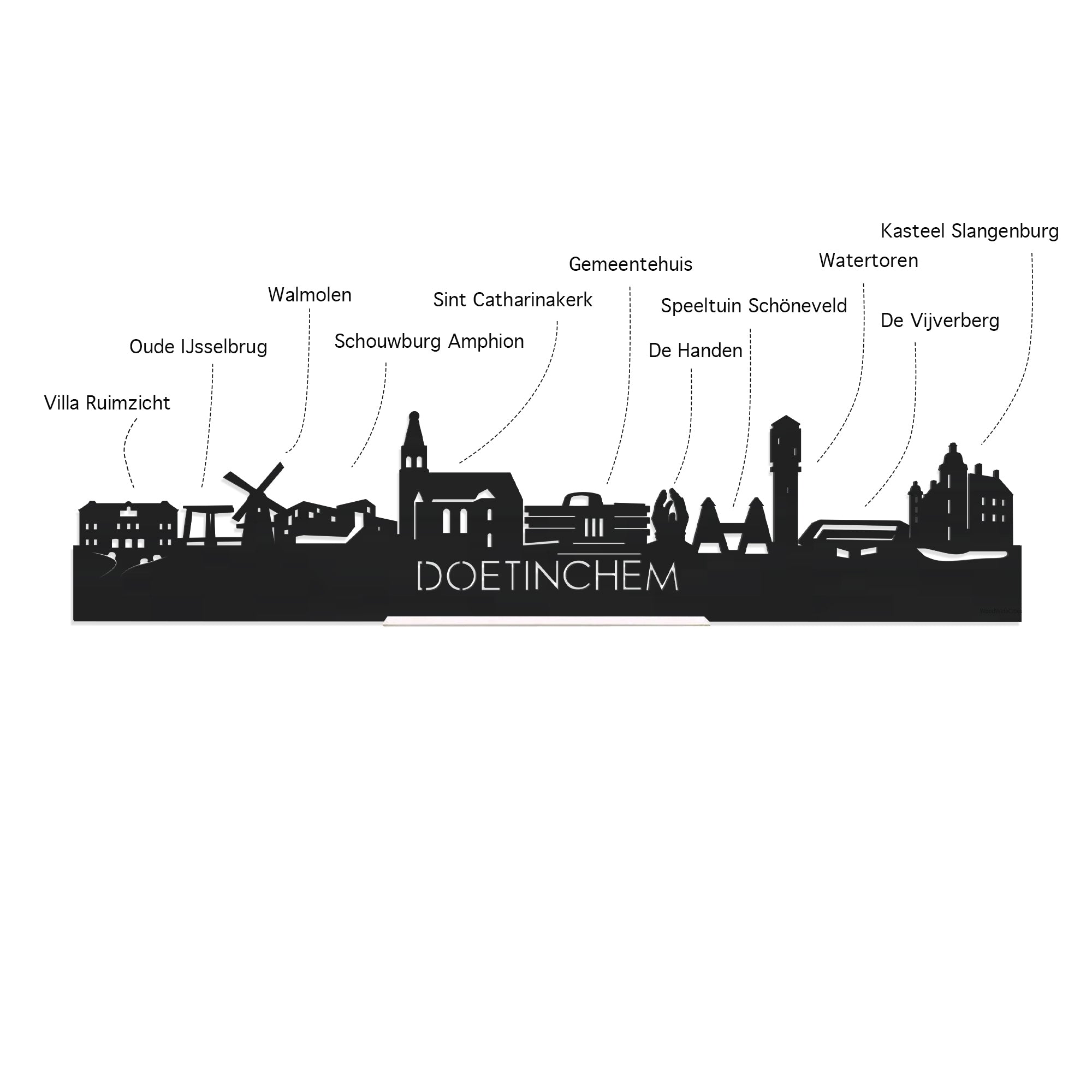 Ontdek de hoogtepunten van Doetinchem. De skyline is gemaakt in samenwerking met locals uit Doetinchem. Je ziet Villa Ruimzicht, Oude IJsselbrug, Walmolen, Schouwburg Amphion, Sint Catharinakerk, Gemeentehuis Doetinchem, De Handen, Speeltuin Schöneveld, Watertoren Doetinchem, De Vijverberg en Kasteel Slangenburg.