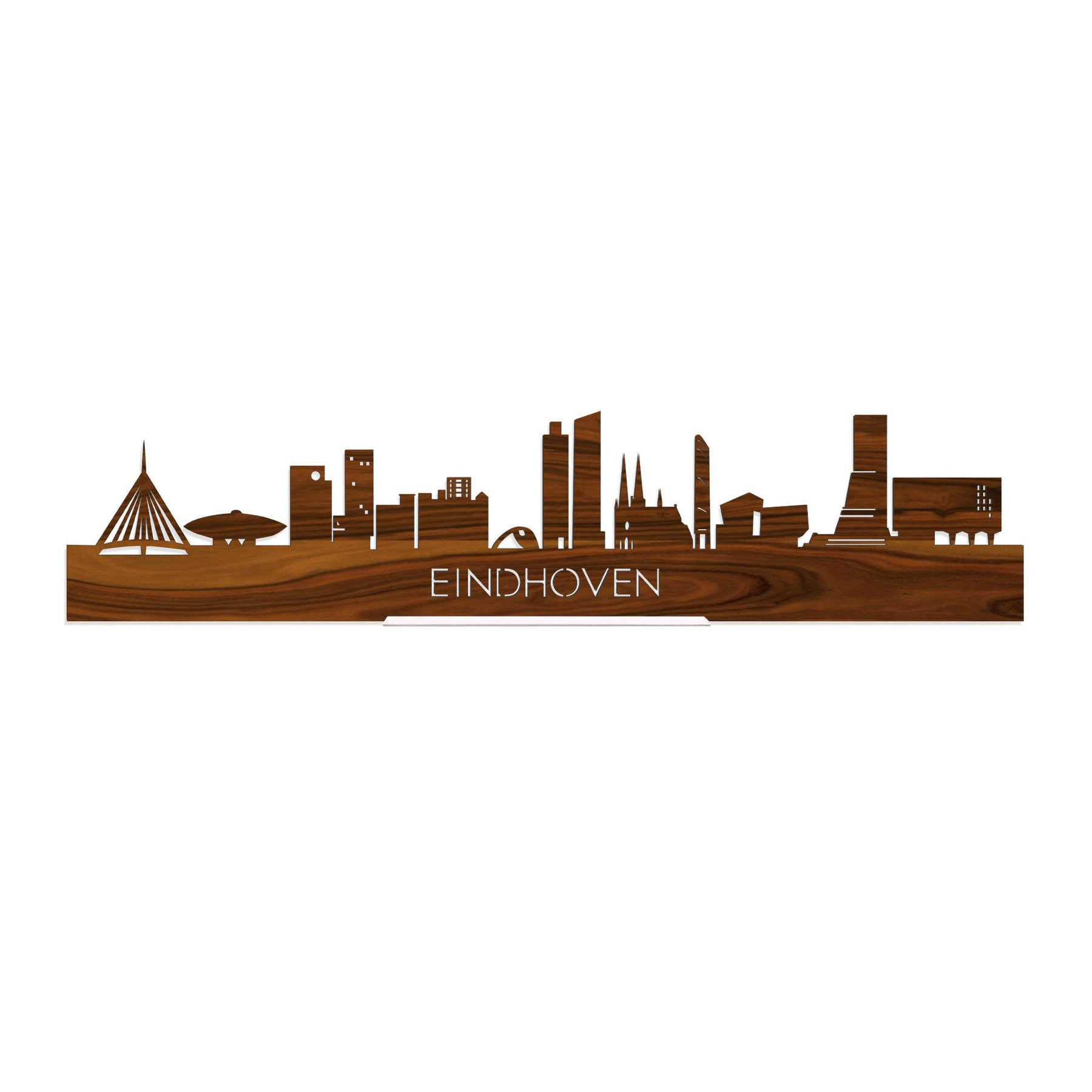 Je herkent ze vast allemaal; de hoogtepunten van deze geliefde plaats: Hovenring, Evoluon, Klokgebouw, Haasje Over, Witte Dame met Lichttoren, Blob, De Regent, De Admirant, Sint-Catharinakerk, Vestedatoren, Van Abbemuseum, Bunkertoren, TU Eindhoven. De skyline is gemaakt in samenwerking met Eindhoven ondernemers en het silhouet komt uit het creatieve brein van een architect, dus alle verhoudingen kloppen.