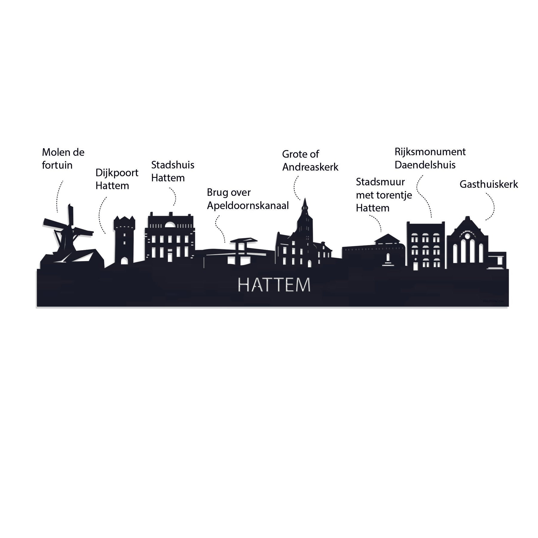 Je herkent ze vast allemaal; de hoogtepunten van deze geliefde plaats: Molen de fortuin, Dijkpoort Hattem, Stadshuis Hattem, Brug over Apeldoornskanaal, Grote of Andreaskerk, Stadsmuur met toretnej Hattem, Rijksmonument Daendelshuis, Gasthuiskerk. De skyline is gemaakt in samenwerking met Hattem ondernemers en het silhouet komt uit het creatieve brein van een architect, dus alle verhoudingen kloppen.
