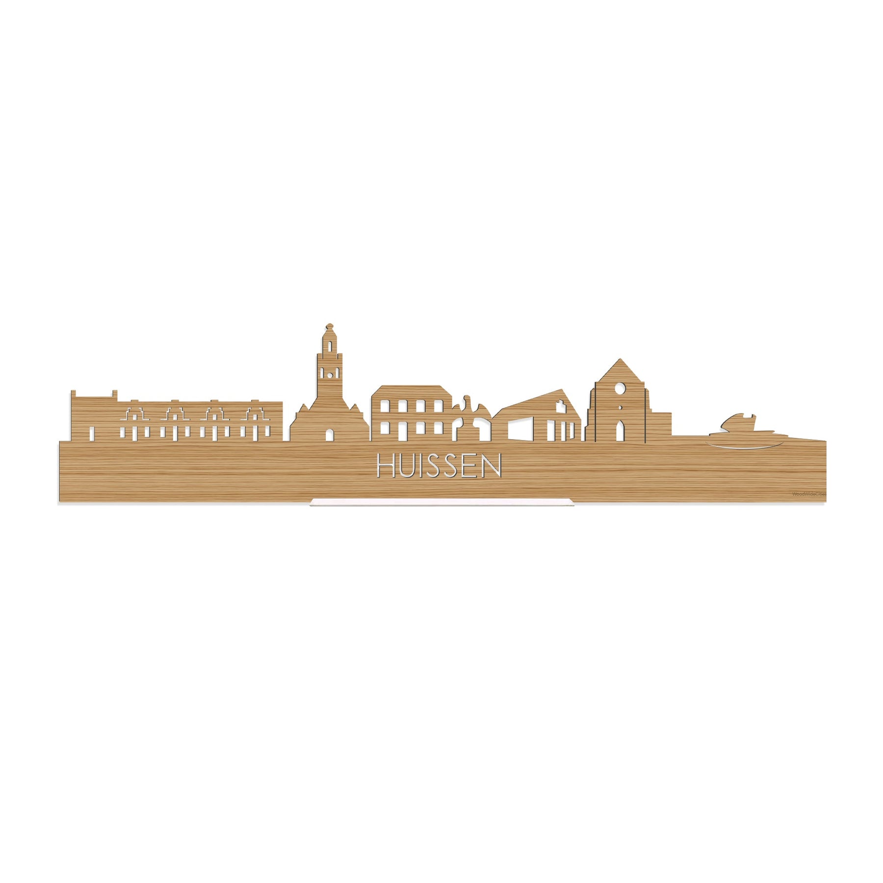 De skyline van Huissen is verkrijgbaar in verschillende soorten hout: zwart MDF, eiken, bamboe, noten en palissander. De houtsoorten zijn duurzaam, ecologisch en gekeurd. Dat vinden wij belangrijk! Bij het produceren van houten decoraties komen geen schadelijke stoffen vrij, hout gaat langer mee en het is biologisch afbreekbaar. Daarnaast is de houten afwerking bij elke skyline anders. Dat maakt jouw skyline uniek!