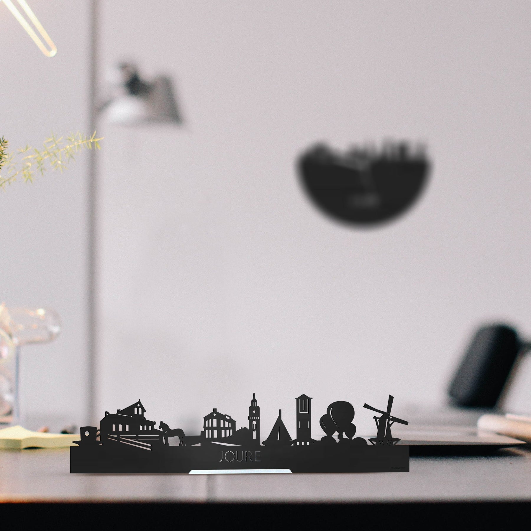 Je herkent ze vast allemaal; de hoogtepunten van deze geliefde plaats: Joustertoer DE Kopje, Metaalfabriek Geelgieterij Keverling, Frische Paard, Hotel Anne-Klare, De Hobbe van Baerdt Tsjerke, Jouster Skutsje, Watertoren Joure, Luchtballonnen, Penninga's Molen. De skyline is gemaakt in samenwerking met Joure ondernemers en het silhouet komt uit het creatieve brein van een architect, dus alle verhoudingen kloppen.