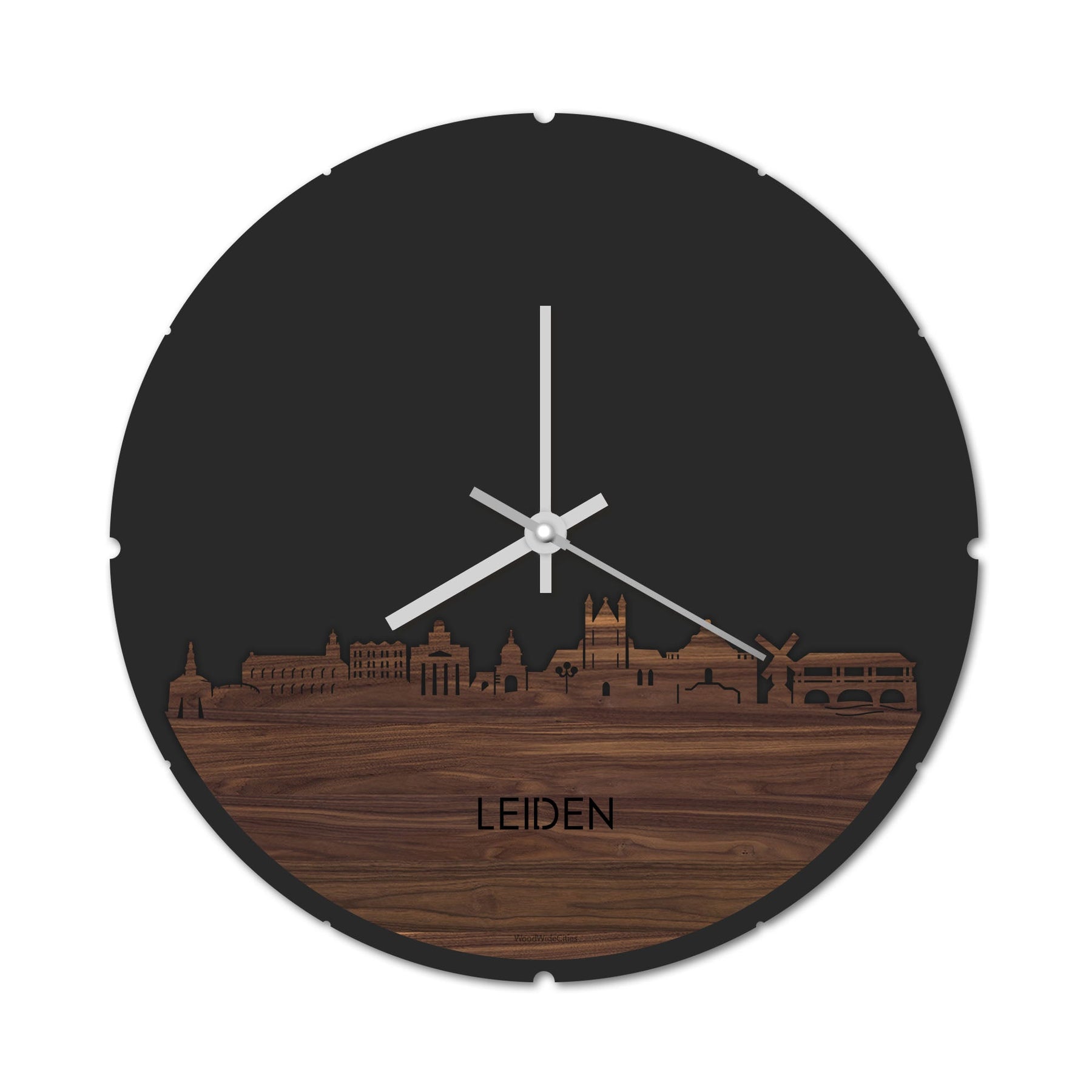 Blijf bij de tijd met de ronde skyline wandklok Dat geldt dubbelop als je deze multifunctionele houten wandklok van WoodWideCities in huis haalt. Deze klok met afbeelding van de skyline van Leiden houdt je bij de tijd, maar neemt je ook mee terug naar de stad waar je bent geboren of waar je hebt gestudeerd. Een mooie herinnering, elke keer als je kijkt hoe laat het is! Of wat dacht je van een afscheidscadeau, een tijdloos geschenk voor moeder- of vaderdag en andere mijlpalen zoals trouwerijen, het behalen van diploma’s en het openen van een nieuw kantoor of bedrijf, een spetterende binnenkomer voor je kind die gaat studeren in een andere stad of een ideaal cadeau voor de housewarming van kennissen en vrienden.