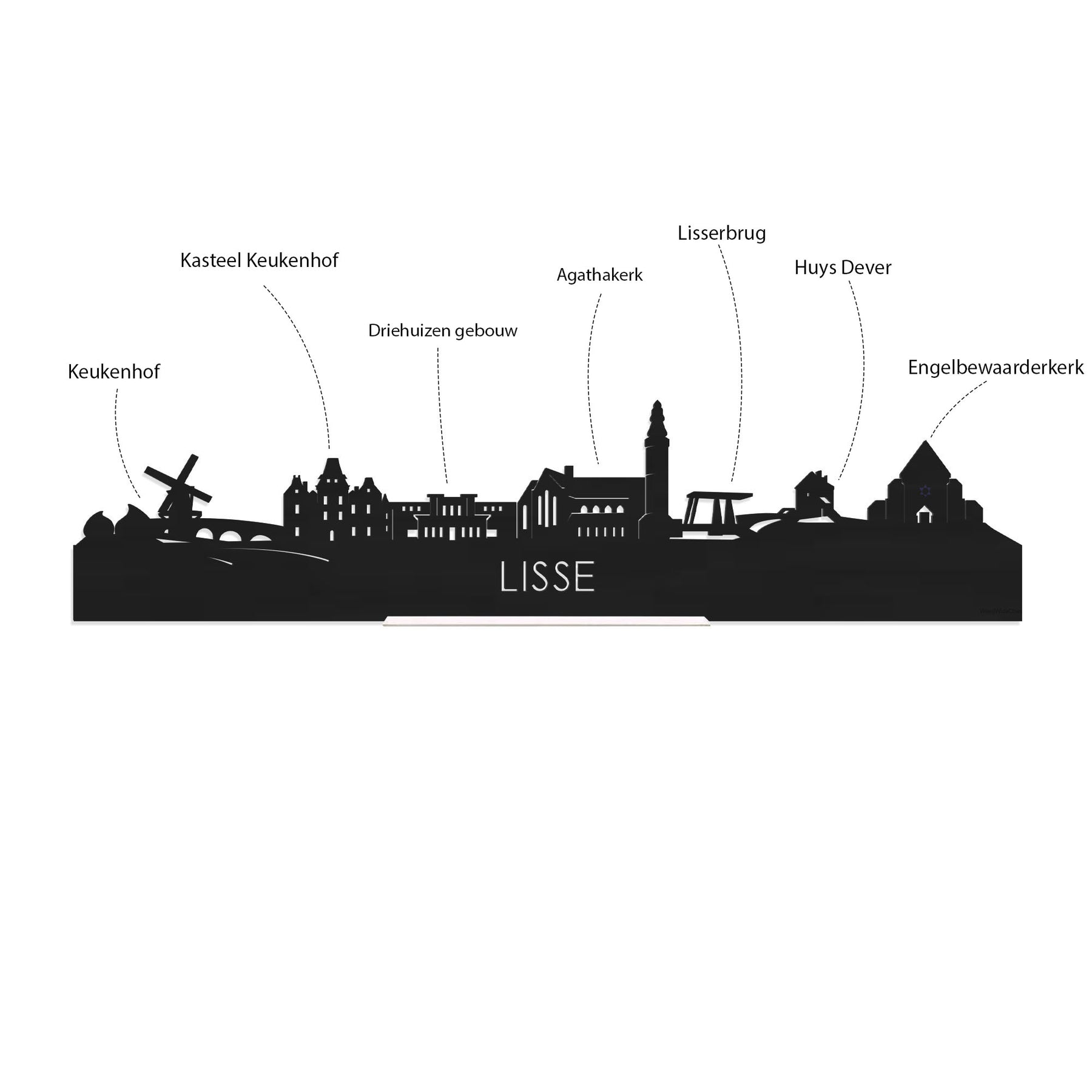 Je herkent ze vast allemaal; de hoogtepunten van deze geliefde plaats: Keukenhof, Kasteel Keukenhof, Driehuizen gebouw, Agathakerk, Lisserbrug, Huys Dever, Engelbewaarderkerk. De skyline is gemaakt in samenwerking met inwoners uit Lisse en het silhouet komt uit het creatieve brein van onze eigen kunstenares. Met liefde gemaakt!