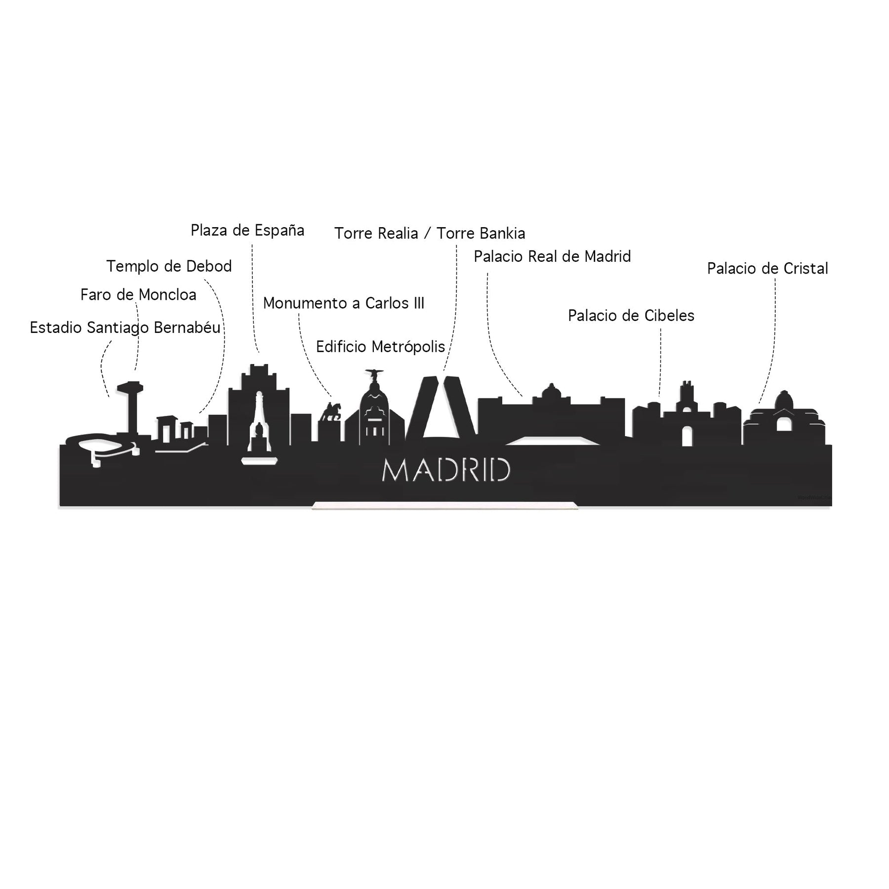 Je herkent ze vast allemaal; de hoogtepunten van deze geliefde plaats: Estadio Santiago Bernabéu, Faro de Moncloa, Templo de Debod, Plaza de España, Monumento a Carlos III, Edificio Metrópolis, Torre Realia / Torre Bankia, Palacio Real de Madrid, Palacio de Cibeles, Palacio de Cristal. De skyline is gemaakt in samenwerking met inwoners uit Madrid en het silhouet komt uit het creatieve brein van onze eigen kunstenares. Met liefde gemaakt!