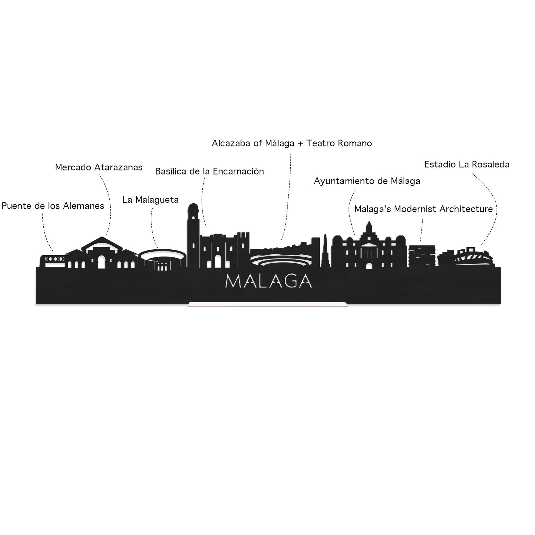 Je herkent ze vast allemaal; de hoogtepunten van deze geliefde plaats: Puente de los Alemanes, Mercado Atarazanas, Basílica de la Encarnación, Alcazaba of Málaga + Teatro Romano, Ayuntamiento de Málaga, Malaga's Modernist Architecture, Estadio La Rosaleda. De skyline is gemaakt in samenwerking met inwoners uit Malaga en het silhouet komt uit het creatieve brein van onze eigen kunstenares. Met liefde gemaakt!