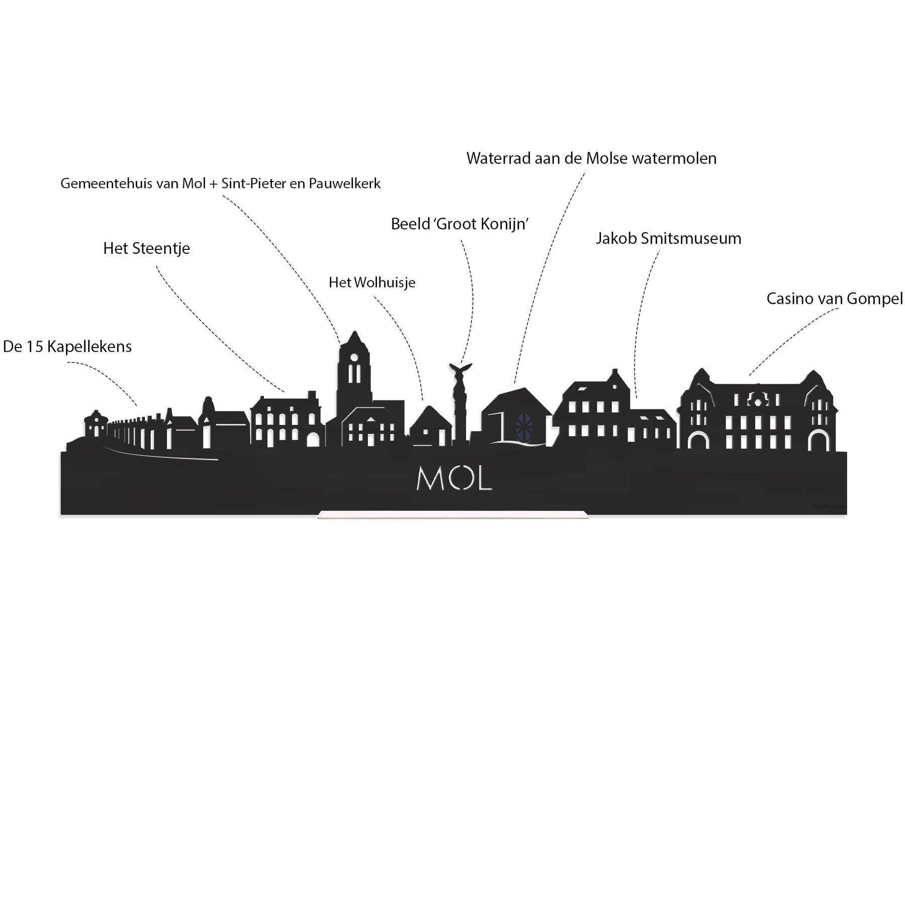 Je herkent ze vast allemaal; de hoogtepunten van deze geliefde plaats: De 15 Kapellekens, Het Steentje, Gemeentehuis van Mol, Sint-Pieter en Pauwelkerk, Het Wolhuisje, Beeld ‘Groot Konijn’, Waterrad aan de Molse watermolen, Jakob Smitsmuseum, Casino van Gompel . De skyline is gemaakt in samenwerking met inwoners uit Mol en het silhouet komt uit het creatieve brein van onze eigen kunstenares. Met liefde gemaakt!