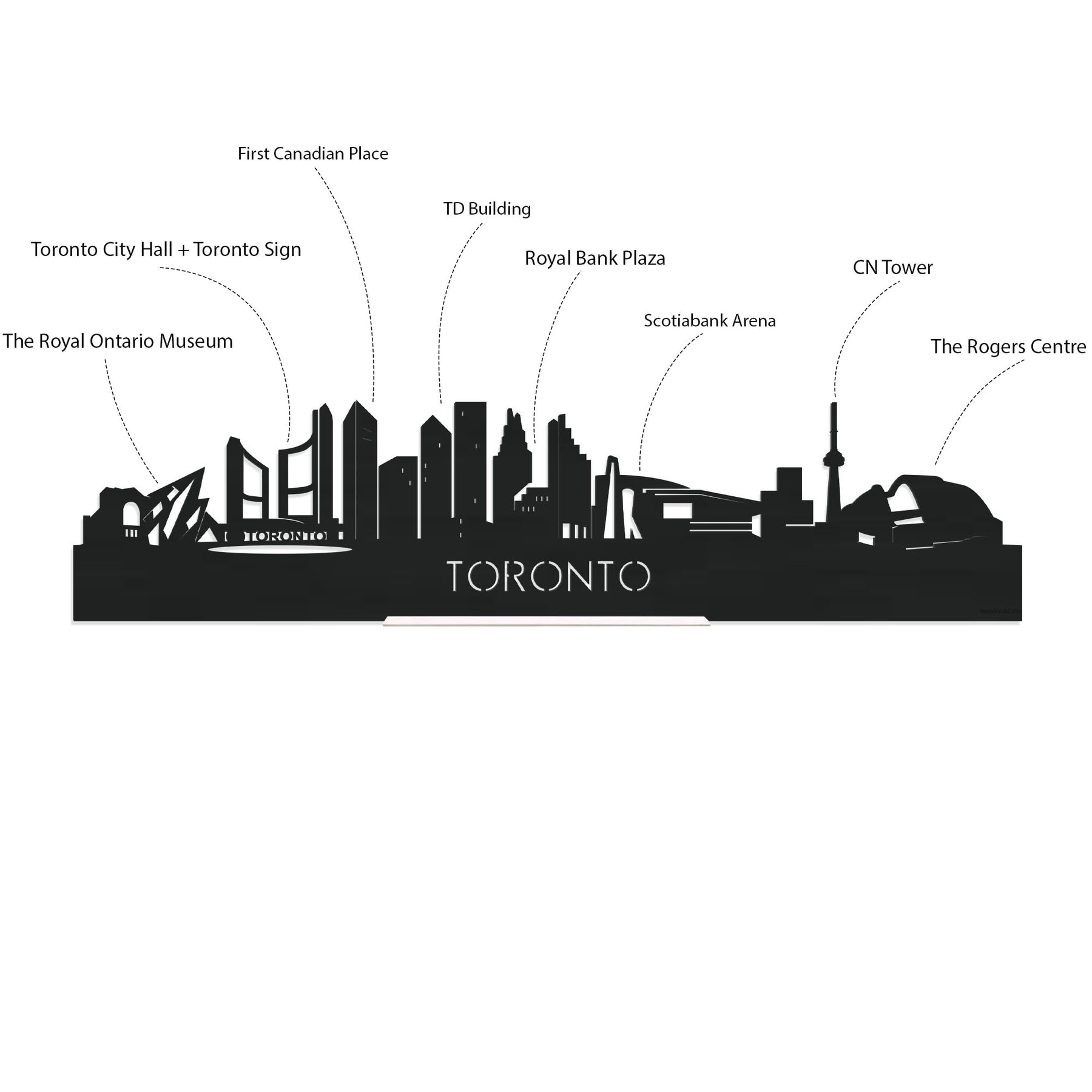 Je herkent ze vast allemaal; de hoogtepunten van deze geliefde plaats: The Royal Ontario Museum, Toronto City Hall + Toronto Sign, First Canadian Place, TD Building, Royal Bank Plaza, Scotiabank Arena, CN Tower, The Rogers Centre . De skyline is gemaakt in samenwerking met inwoners uit Toronto en het silhouet komt uit het creatieve brein van onze eigen kunstenares. Met liefde gemaakt!
