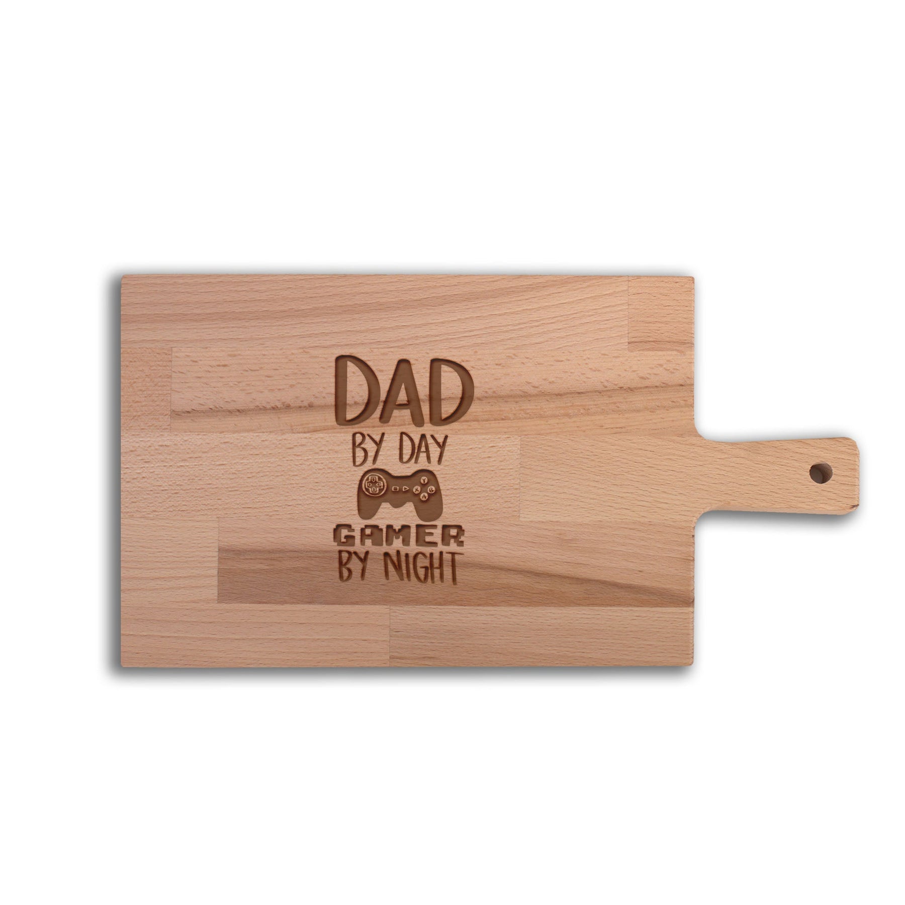Deze serveerplank is niet alleen mooi en duurzaam, maar ook handgemaakt in Nederland. Op zoek naar een cadeau voor vaderdag? Dan is deze serveerplank met een prachtige Dad by Day Gamer by Night gravure het perfecte cadeau!