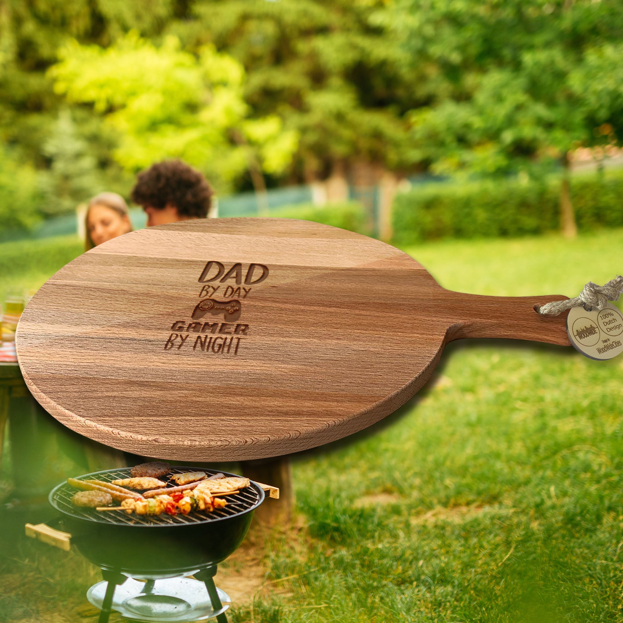 Deze serveerplank is niet alleen mooi en duurzaam, maar ook handgemaakt in Nederland. Op zoek naar een cadeau voor vaderdag? Dan is deze serveerplank met een prachtige Dad by Day Gamer by Night gravure het perfecte cadeau!