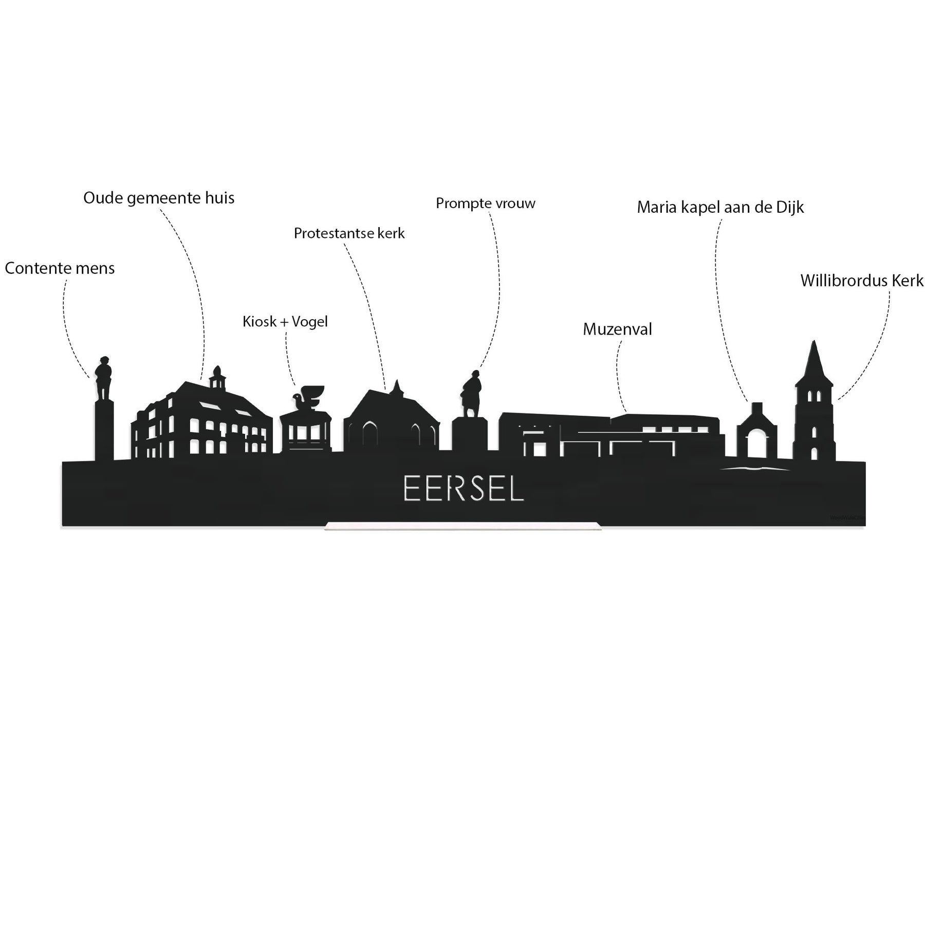 Je herkent ze vast allemaal; de hoogtepunten van deze geliefde plaats: Contente mens, Oude gemeente huis, Kiosk. Prompte vrouw, Protestantse kerk, Muzenval, Nieuwe gemeentehuis, Maria kapel aan de Dijk, Willibrordus Kerk, Vogel. De skyline is gemaakt in samenwerking met inwoners uit Eersel en het silhouet komt uit het creatieve brein van onze eigen kunstenares. Met liefde gemaakt!