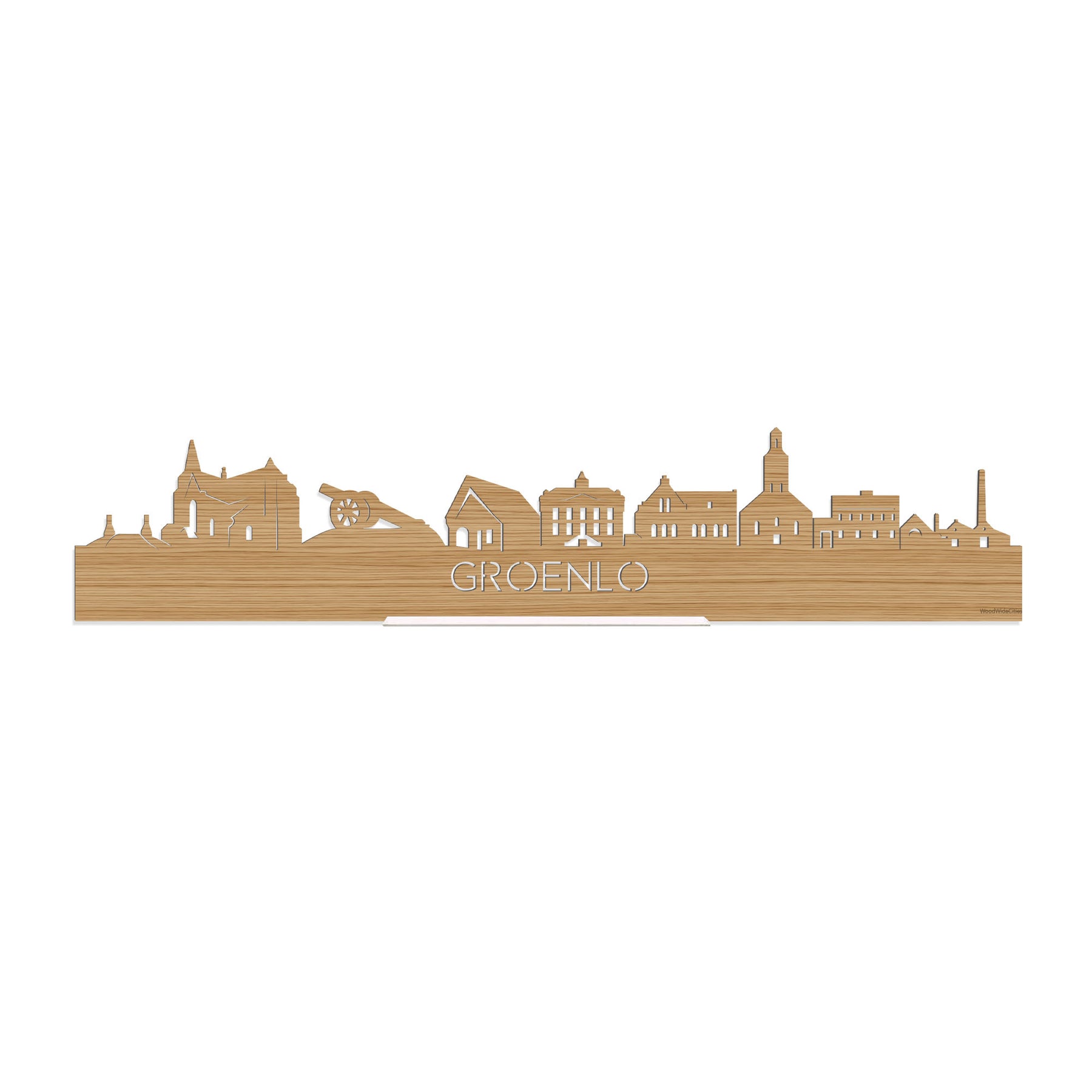 De skyline van Groenlo is verkrijgbaar in verschillende soorten hout: zwart MDF, eiken, bamboe, noten en palissander. De houtsoorten zijn duurzaam, ecologisch en gekeurd. Dat vinden wij belangrijk! Bij het produceren van houten decoraties komen geen schadelijke stoffen vrij, hout gaat langer mee en het is biologisch afbreekbaar. Daarnaast is de houten afwerking bij elke skyline anders. Dat maakt jouw skyline uniek!