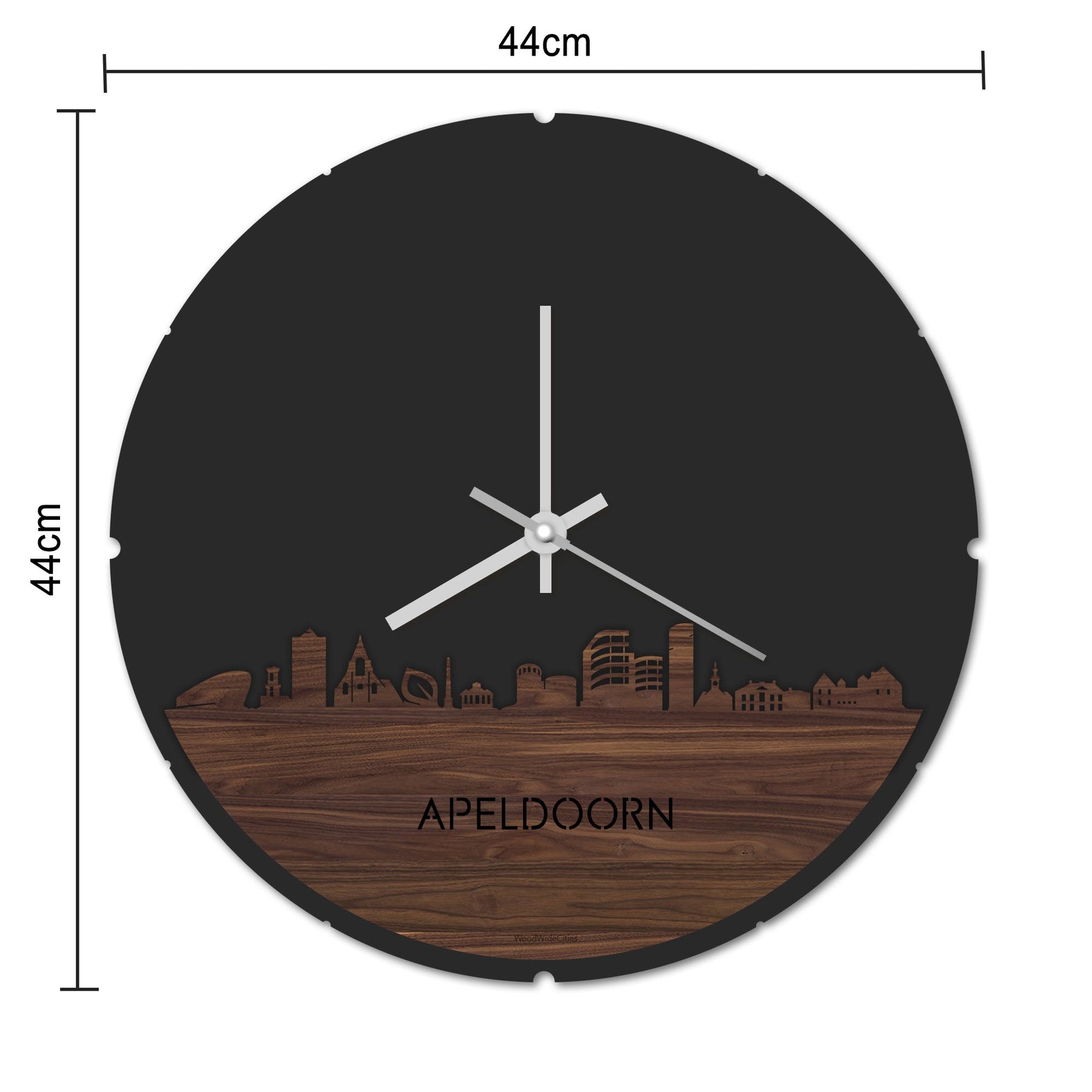 Blijf bij de tijd met de ronde skyline wandklok Dat geldt dubbelop als je deze multifunctionele houten wandklok van WoodWideCities in huis haalt. Deze klok met afbeelding van de skyline van Apeldoorn houdt je bij de tijd, maar neemt je ook mee terug naar de stad waar je bent geboren of waar je hebt gestudeerd. Een mooie herinnering, elke keer als je kijkt hoe laat het is! Of wat dacht je van een afscheidscadeau, een tijdloos geschenk voor moeder- of vaderdag en andere mijlpalen zoals trouwerijen, het behalen van diploma’s en het openen van een nieuw kantoor of bedrijf, een spetterende binnenkomer voor je kind die gaat studeren in een andere stad of een ideaal cadeau voor de housewarming van kennissen en vrienden.