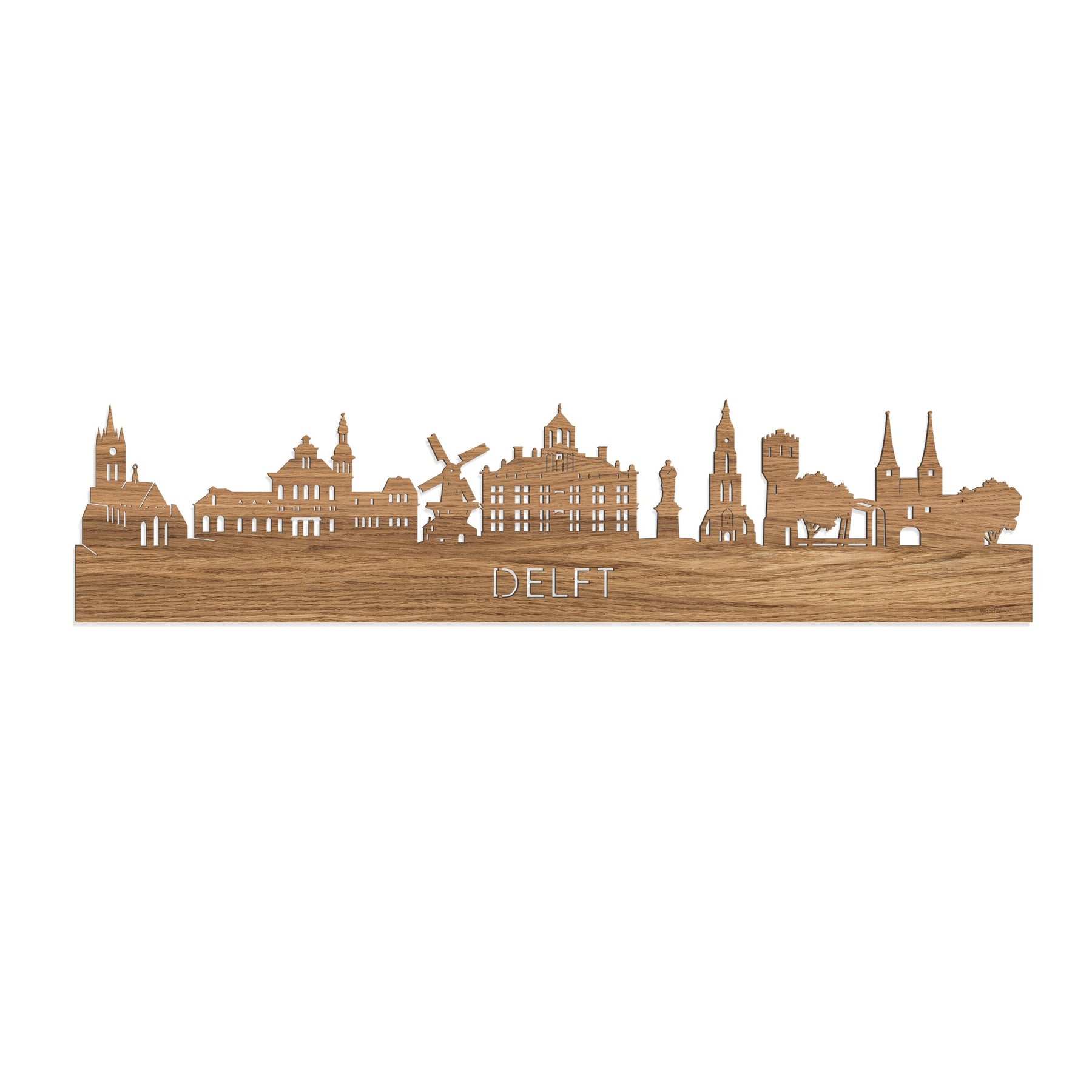 You probably recognize them all; the highlights of this beloved place: Oude Kerk Delft, Delft Station, Molen de Roos, City Hall Delft, Hugo de Groot, Nieuwe Kerk Delft, Watertoren Delft and Oostpoort Delft. The skyline was created in collaboration with Delft entrepreneurs and the silhouette comes from the creative brain of an architect, so all proportions are correct.