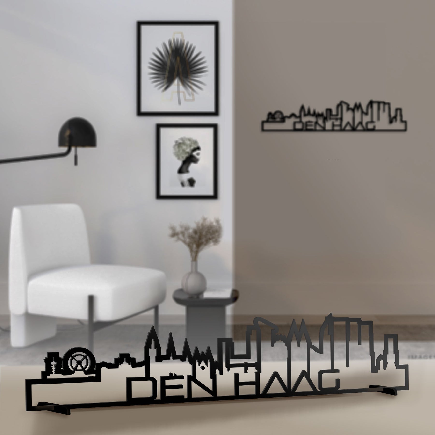 Je herkent ze vast allemaal, de hoogtepunten van deze mooie plaats. De skyline is gemaakt in samenwerking met locals en het silhouet komt uit het creatieve brein van onze vormgeefster. Je ziet Bungeetoren, Pier Scheveningen, Het Kurhaus, Het Vredespaleis, Binnenhof, New Babylon, Het Strijkijzer, Zurichtoren, Haagse Tieten / Castalia, Hoftoren, Prinsenhof, JuBi Gebouw, Gracht met grachtenpand, Parktoren Pharos.