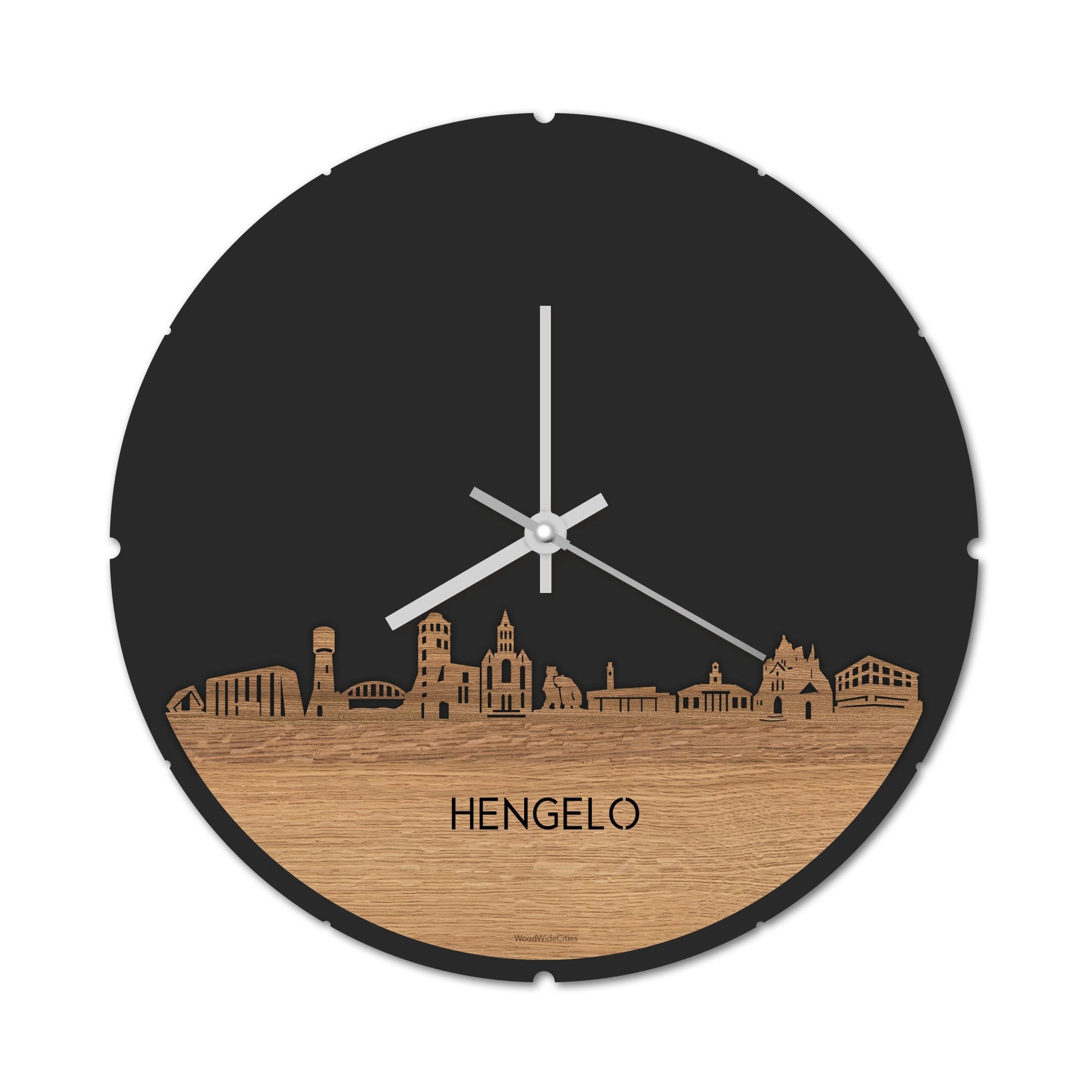 Blijf bij de tijd met de ronde skyline wandklok Dat geldt dubbelop als je deze multifunctionele houten wandklok van WoodWideCities in huis haalt. Deze klok met afbeelding van de skyline van Hengelo houdt je bij de tijd, maar neemt je ook mee terug naar de stad waar je bent geboren of waar je hebt gestudeerd. Een mooie herinnering, elke keer als je kijkt hoe laat het is! Of wat dacht je van een afscheidscadeau, een tijdloos geschenk voor moeder- of vaderdag en andere mijlpalen zoals trouwerijen, het behalen van diploma’s en het openen van een nieuw kantoor of bedrijf, een spetterende binnenkomer voor je kind die gaat studeren in een andere stad of een ideaal cadeau voor de housewarming van kennissen en vrienden.