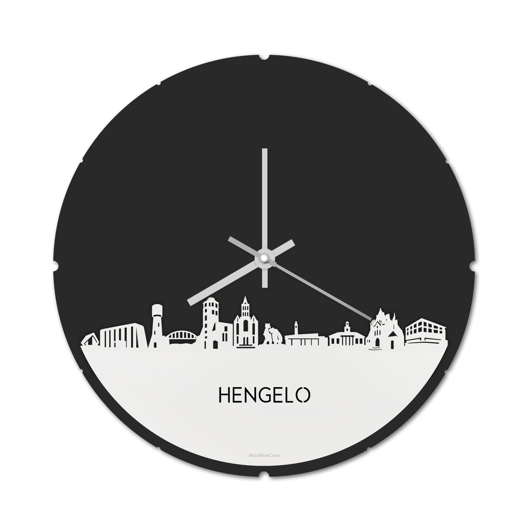 Skyline Klok Rond Hengelo Wit Glanzend houten cadeau decoratie relatiegeschenk van WoodWideCities