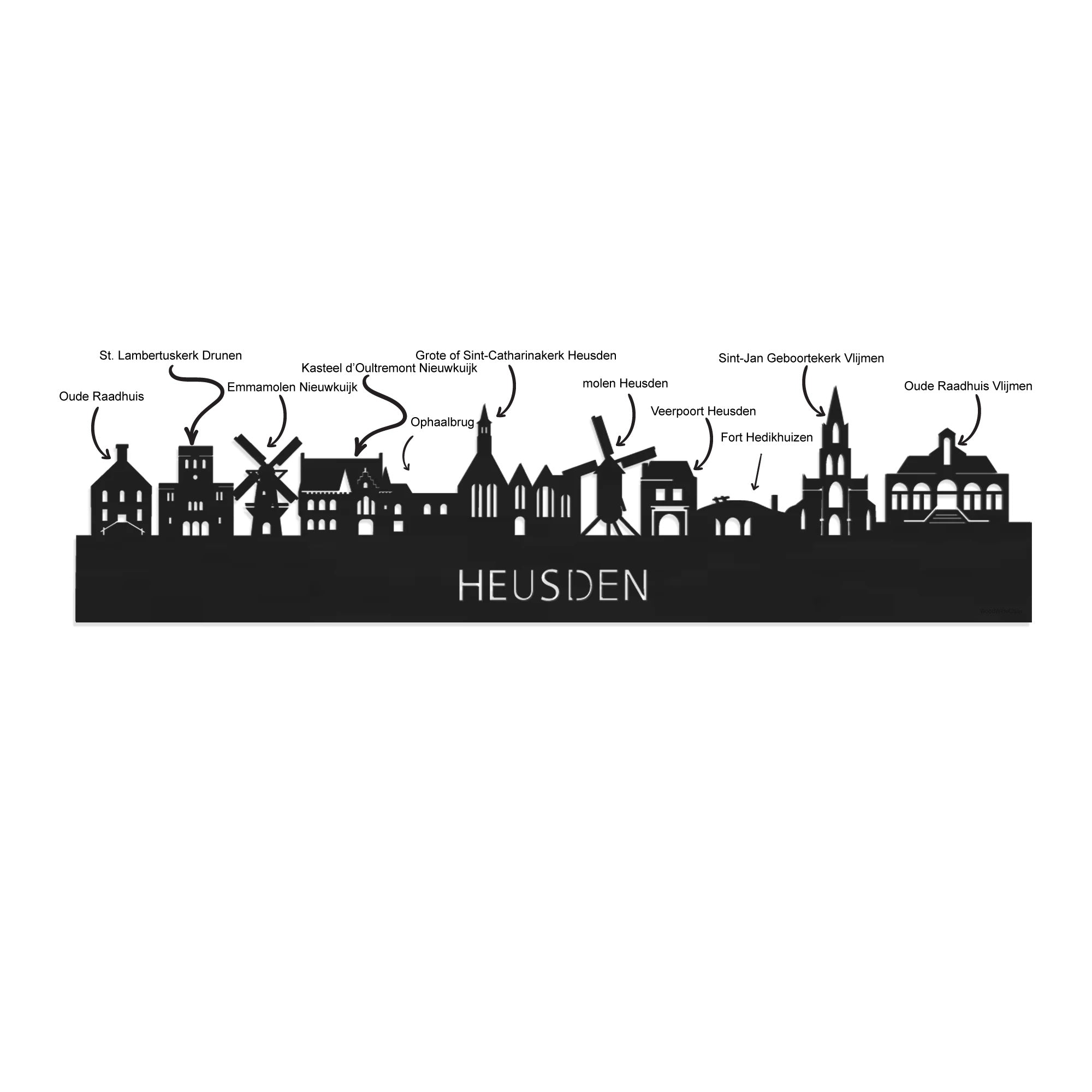 You probably recognize them all; the highlights of this beloved place: Oude Raadhuis Drunen, St. Lambertuskerk Drunen, Emmamolen Nieuwkuijk, Castle d'Oultremont Nieuwkuijk, Grote or Sint-Catharinakerk Heusden, Drawbridge, mill Heusden, Veerpoort Heusden, Fort Hedikhuizen, Sint-Jan Geboortekerk Vlijmen, Oude Town Hall Vlijmen. The skyline was created in collaboration with Heusden entrepreneurs and the silhouette comes from the creative brain of an architect, so all proportions are correct.