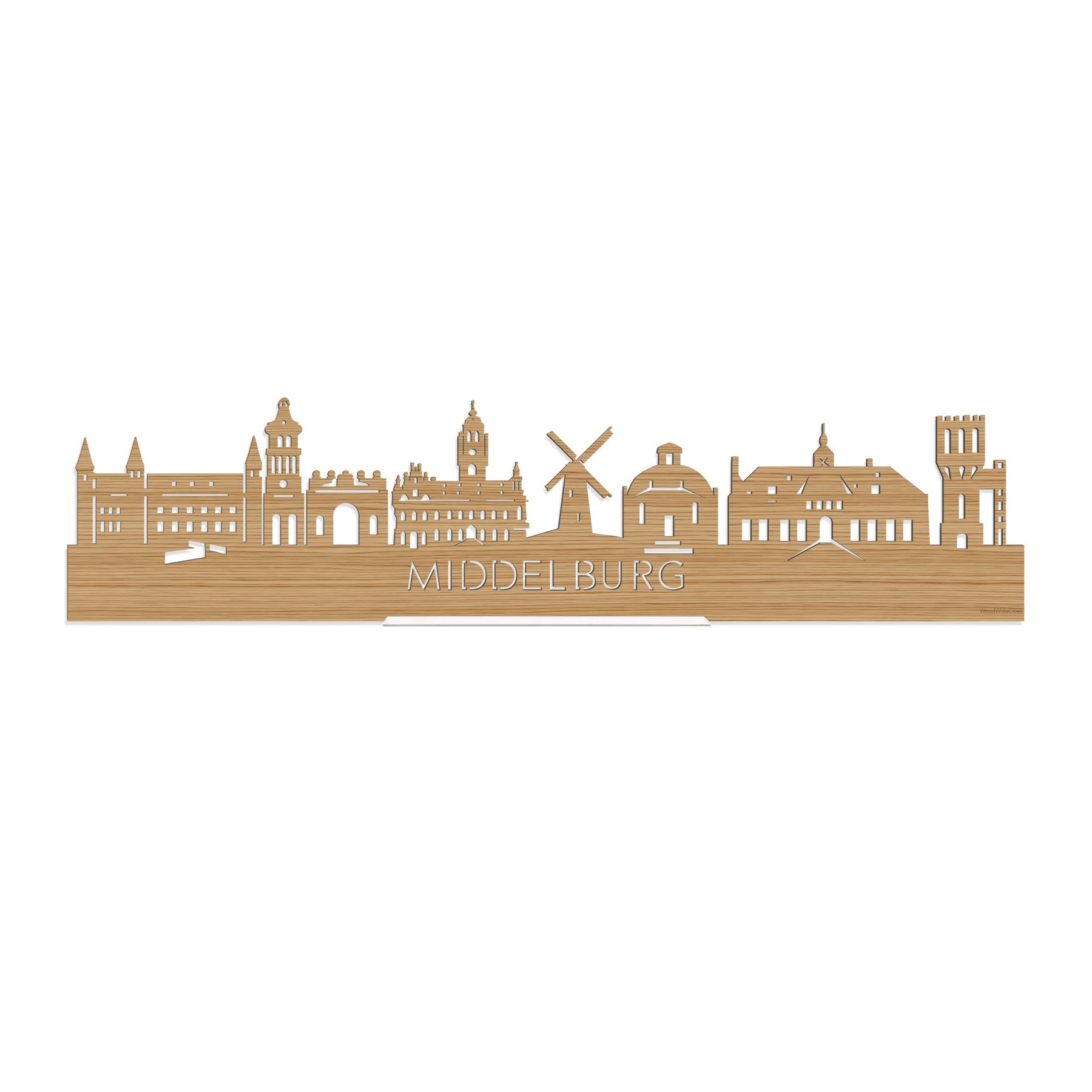 The Middelburg skyline is available in different types of wood: black MDF, oak, bamboo, walnut and rosewood. The types of wood are sustainable, ecological and approved. That's important to us! No harmful substances are released when producing wooden decorations, wood lasts longer and it is biodegradable. In addition, the wooden finish is different for every skyline. That makes your skyline unique!