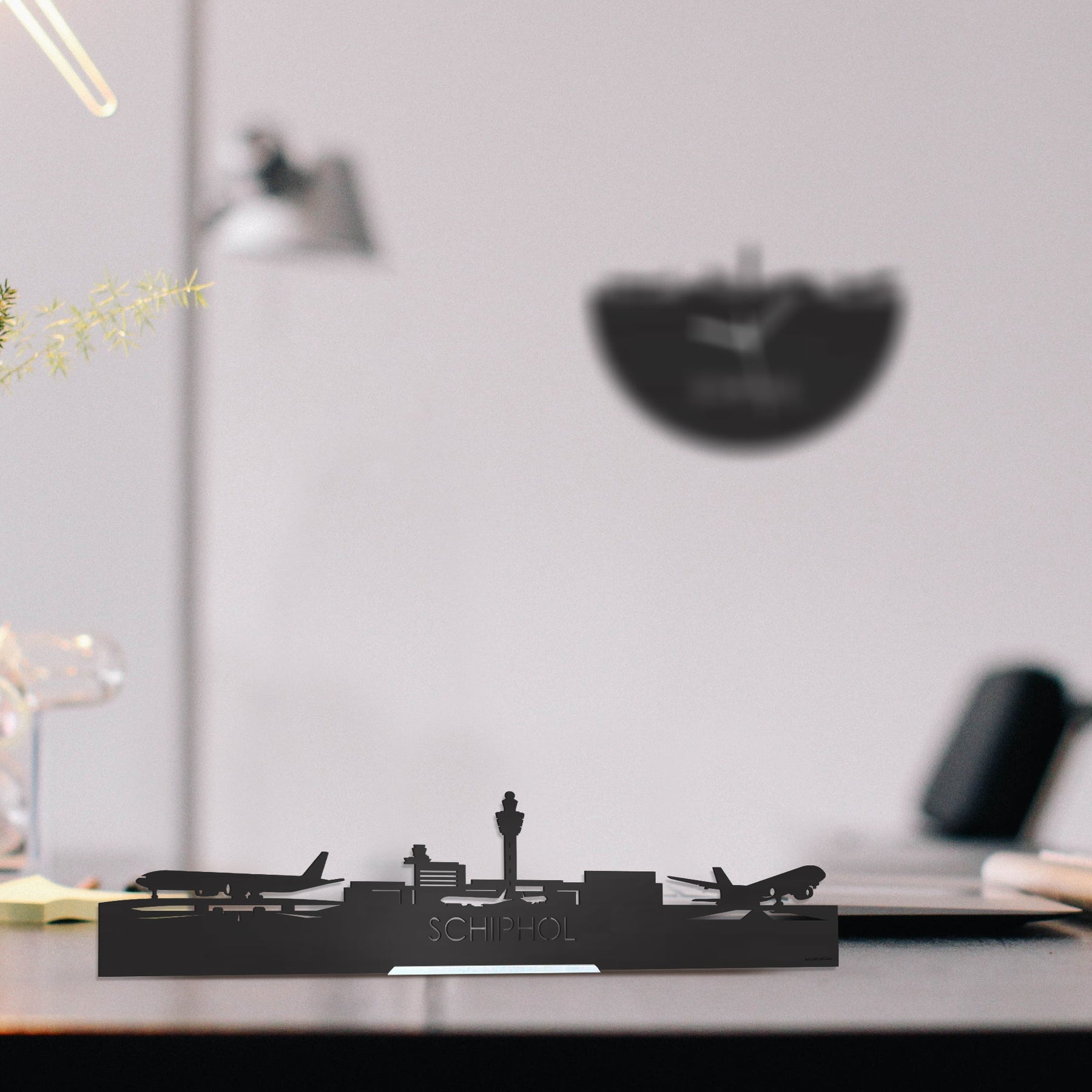 Je herkent ze vast allemaal; de hoogtepunten van deze geliefde plaats: De brug over de snelweg, Boeing 777, Verkeerstoren van Schiphol, Terminal, Landingsbaan en Boeing 787. De skyline is gemaakt in samenwerking met inwoners uit Schiphol en het silhouet komt uit het creatieve brein van onze eigen kunstenares. Met liefde gemaakt!