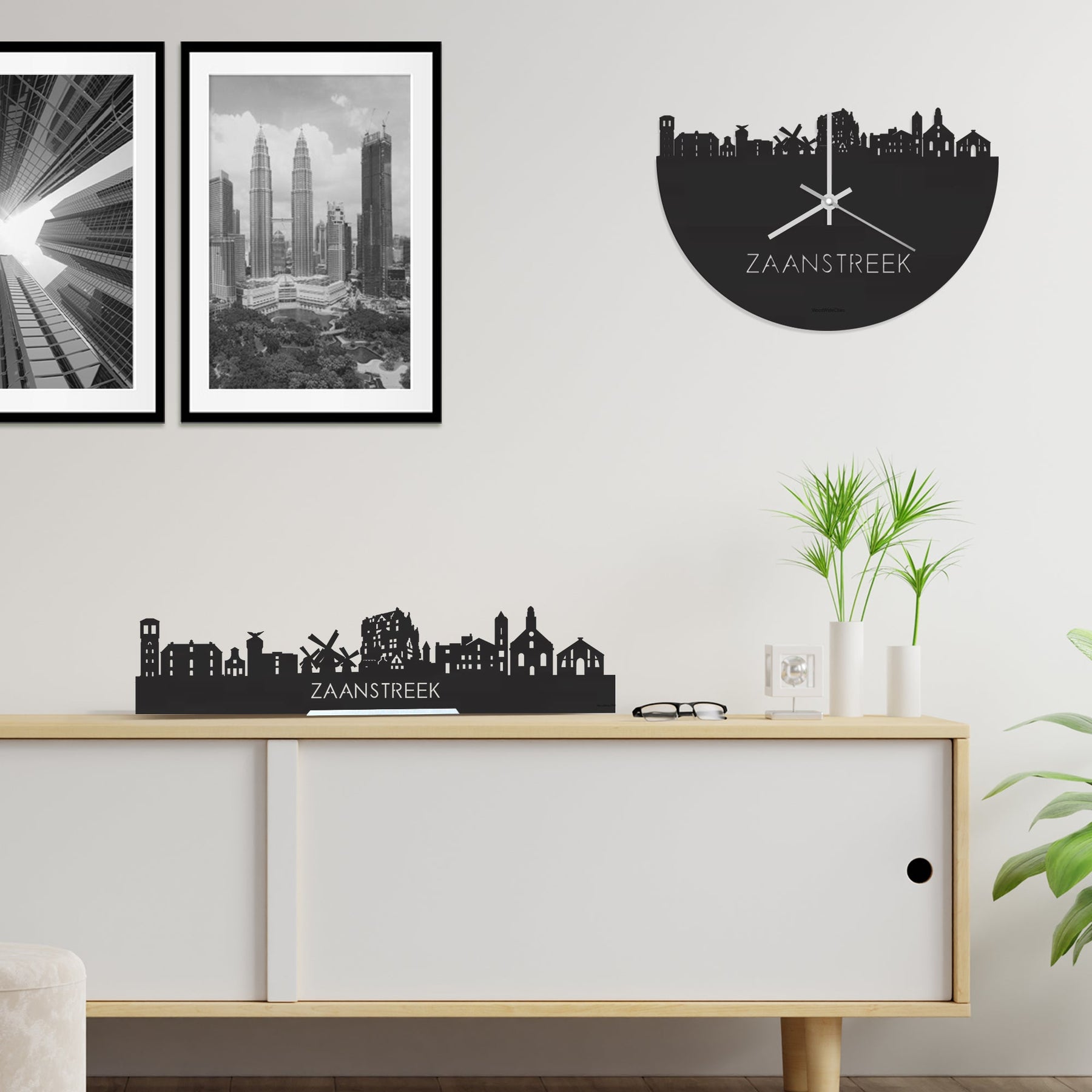 You probably recognize them all; the highlights of this beloved place: The water tower of Assendelft, Pakhuis Batavia, Zaans cottage, Zeepziederij Adelaar in Wormerveer, The windmills of the Zaanse schans, Stacked Zaanse houses, Verkadefabriek, Bullekerk and Tsaar peterhuisje in Zaandam. The skyline was created in collaboration with Zaanstreek entrepreneurs and the silhouette comes from the creative brain of an architect, so all proportions are correct.