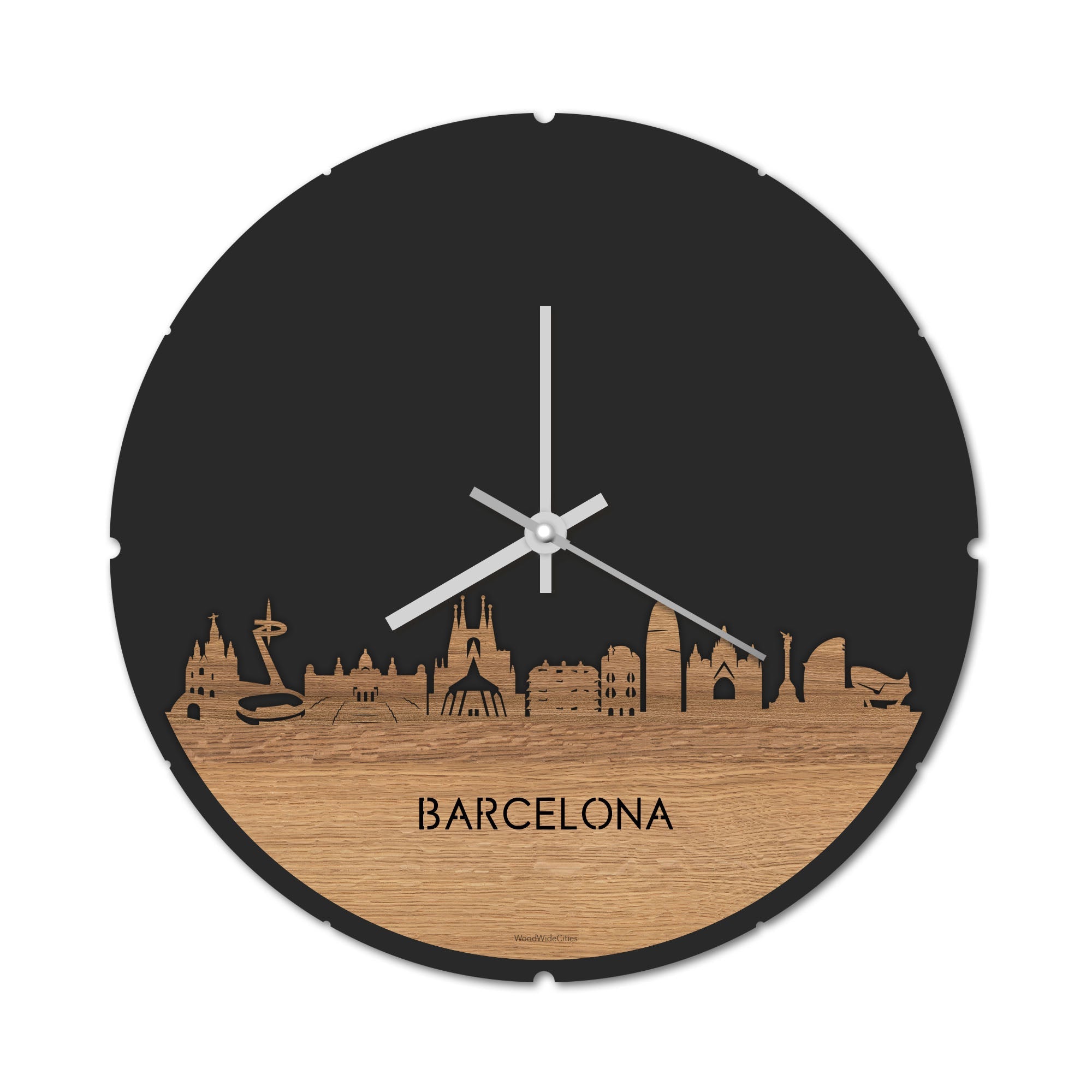 Blijf bij de tijd met de ronde skyline wandklok Dat geldt dubbelop als je deze multifunctionele houten Skyline Klok Rond Barcelona Eiken in huis haalt. Deze klok met de skyline van Barcelona houdt je bij de tijd, maar neemt je ook mee terug naar de stad waar je bent geboren of waar je hebt gestudeerd. Een mooie herinnering, elke keer als je kijkt hoe laat het is! Of wat dacht je van een afscheidscadeau, een tijdloos geschenk voor moeder- of vaderdag en andere mijlpalen zoals trouwerijen, het behalen van diploma’s en het openen van een nieuw kantoor of bedrijf, een spetterende binnenkomer voor je kind die gaat studeren in een andere stad of een ideaal cadeau voor de housewarming van kennissen en vrienden.