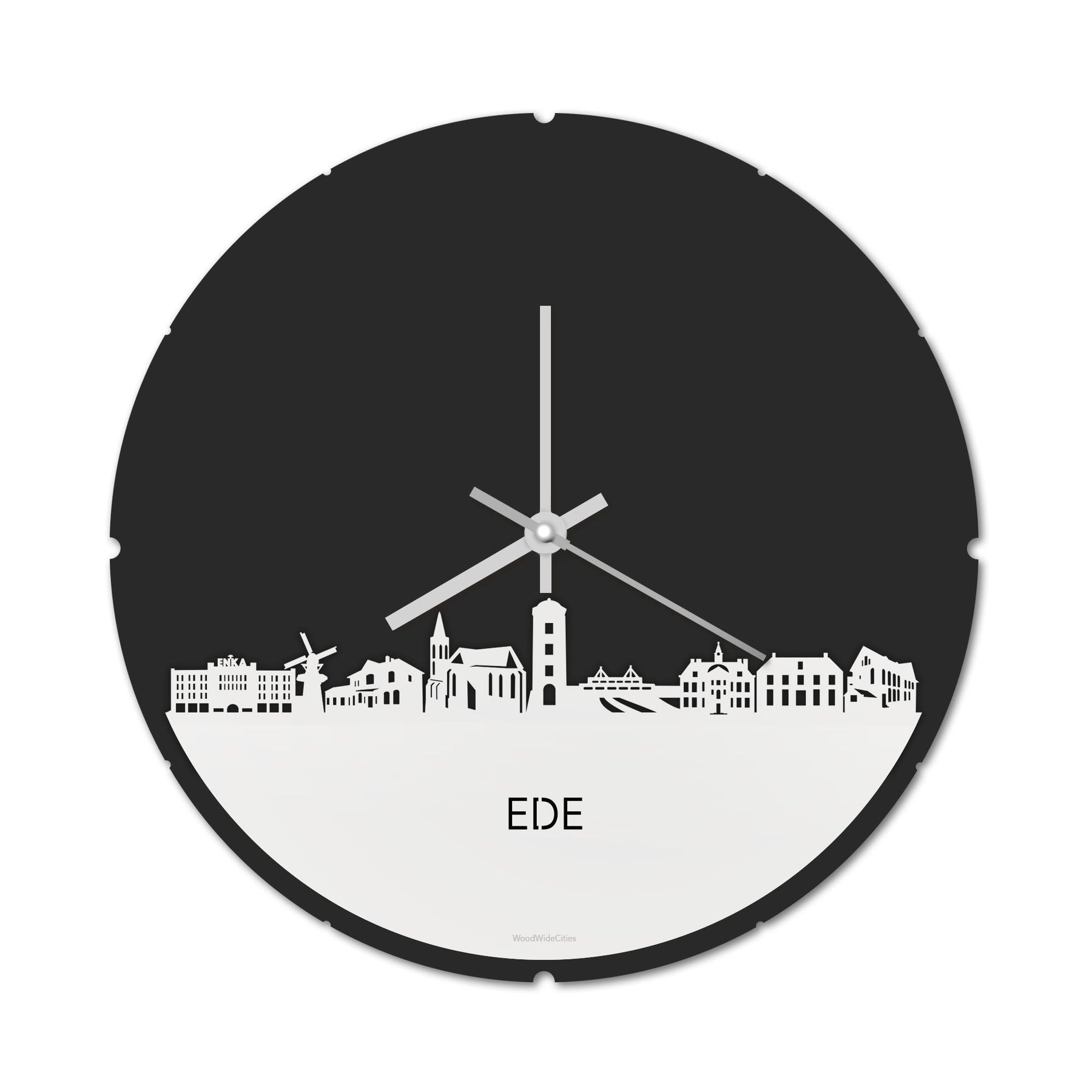 Blijf bij de tijd met de ronde skyline wandklok Dat geldt zeker als je de ronde skyline wandklok gemaakt van 100% gerecycled kunststof (plastic) in huis haalt. Deze skyline klok van Ede houdt je bij de tijd, maar neemt je ook mee terug naar de stad waar je bent opgegroeid of waar je hebt gestudeerd. Een mooie herinnering, elke keer als je kijkt hoe laat het is! Of wat dacht je van een afscheidscadeau, een tijdloos geschenk voor Moeder- of Vaderdag en andere mijlpalen zoals jubilea, trouwerijen, het behalen van diploma’s, het openen van een nieuw kantoor of gewoon voor jezelf. Een bijzondere verrassing voor je kind die gaat studeren in een andere stad of een ideaal cadeau voor de housewarming van kennissen en vrienden.