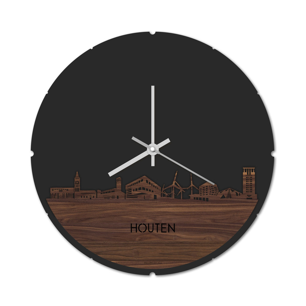 Blijf bij de tijd met de ronde skyline wandklok Dat geldt dubbelop als je deze multifunctionele houten wandklok van WoodWideCities in huis haalt. Deze klok met afbeelding van de skyline van Houten houdt je bij de tijd, maar neemt je ook mee terug naar de stad waar je bent geboren of waar je hebt gestudeerd. Een mooie herinnering, elke keer als je kijkt hoe laat het is! Of wat dacht je van een afscheidscadeau, een tijdloos geschenk voor moeder- of vaderdag en andere mijlpalen zoals trouwerijen, het behalen van diploma’s en het openen van een nieuw kantoor of bedrijf, een spetterende binnenkomer voor je kind die gaat studeren in een andere stad of een ideaal cadeau voor de housewarming van kennissen en vrienden.