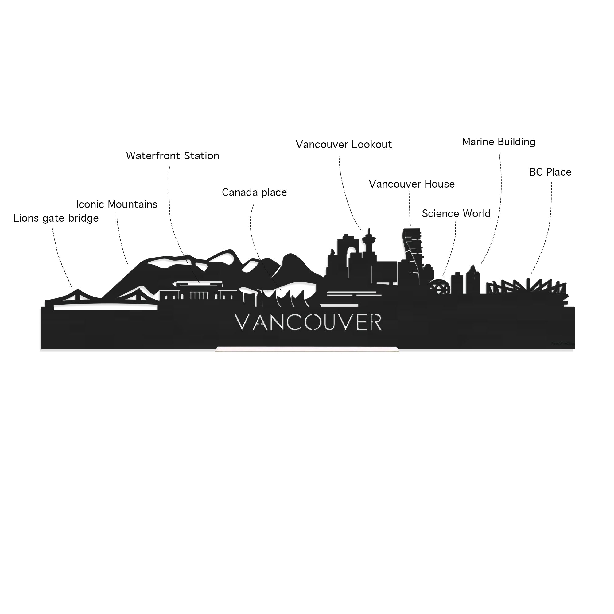 Je herkent ze vast allemaal; de hoogtepunten van deze geliefde plaats: Lions gate bridge, Iconic Mountains, Waterfront Station, Canada place, Vancouver Lookout, Vancouver House, Science World, Marine Building, BC Place. De skyline is gemaakt in samenwerking met inwoners uit Vancouver en het silhouet komt uit het creatieve brein van onze eigen kunstenares. Met liefde gemaakt!