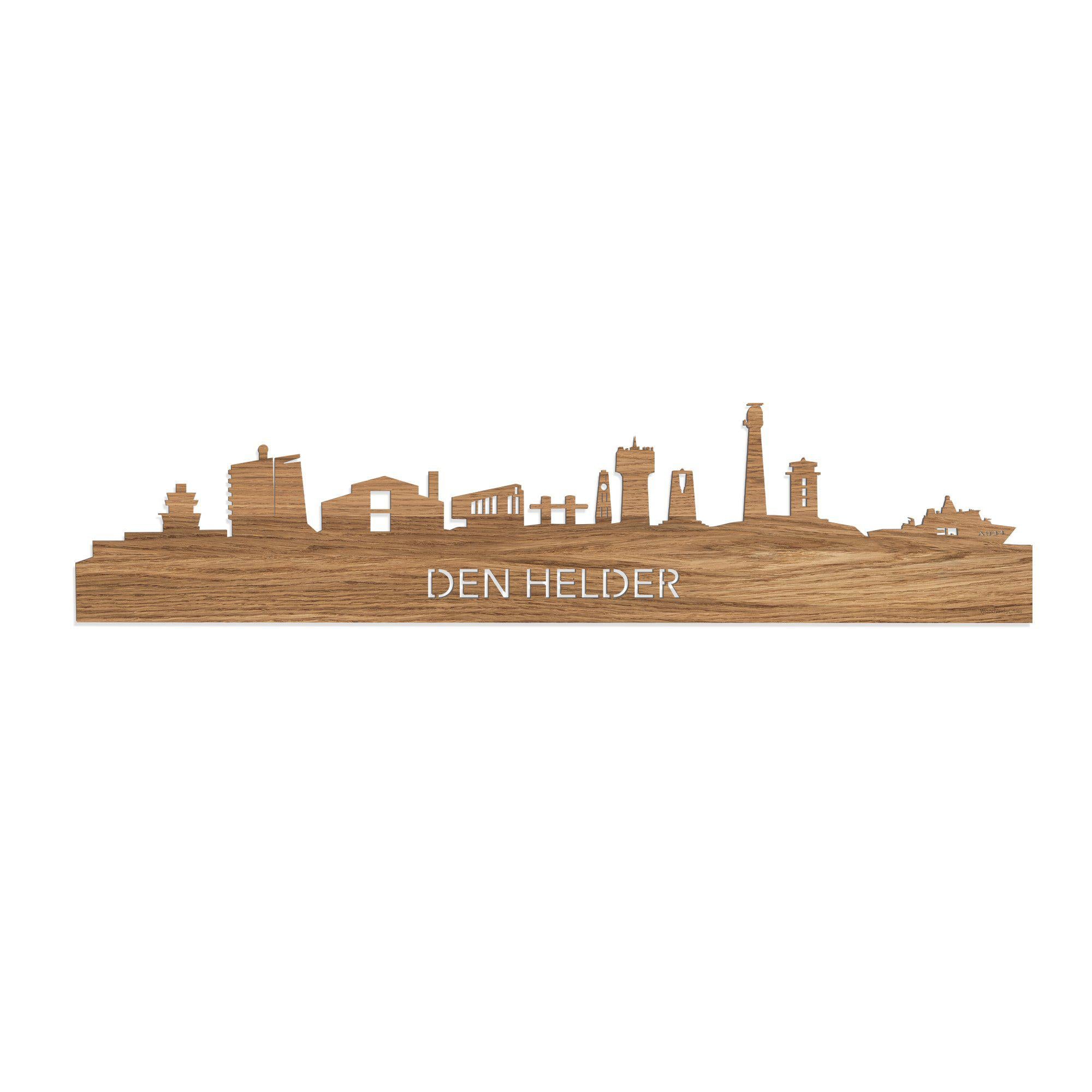 De skyline van Den Helder is verkrijgbaar in verschillende soorten hout: eiken, noten, zwart MDF en palissander. De houtsoorten zijn duurzaam, ecologisch en gekeurd. Dat vinden wij belangrijk! Bij het produceren van houten decoraties komen geen schadelijke stoffen vrij, hout gaat langer mee en het is biologisch afbreekbaar. Daarnaast is de houten afwerking bij elke skyline anders. Dat maakt jouw skyline uniek!