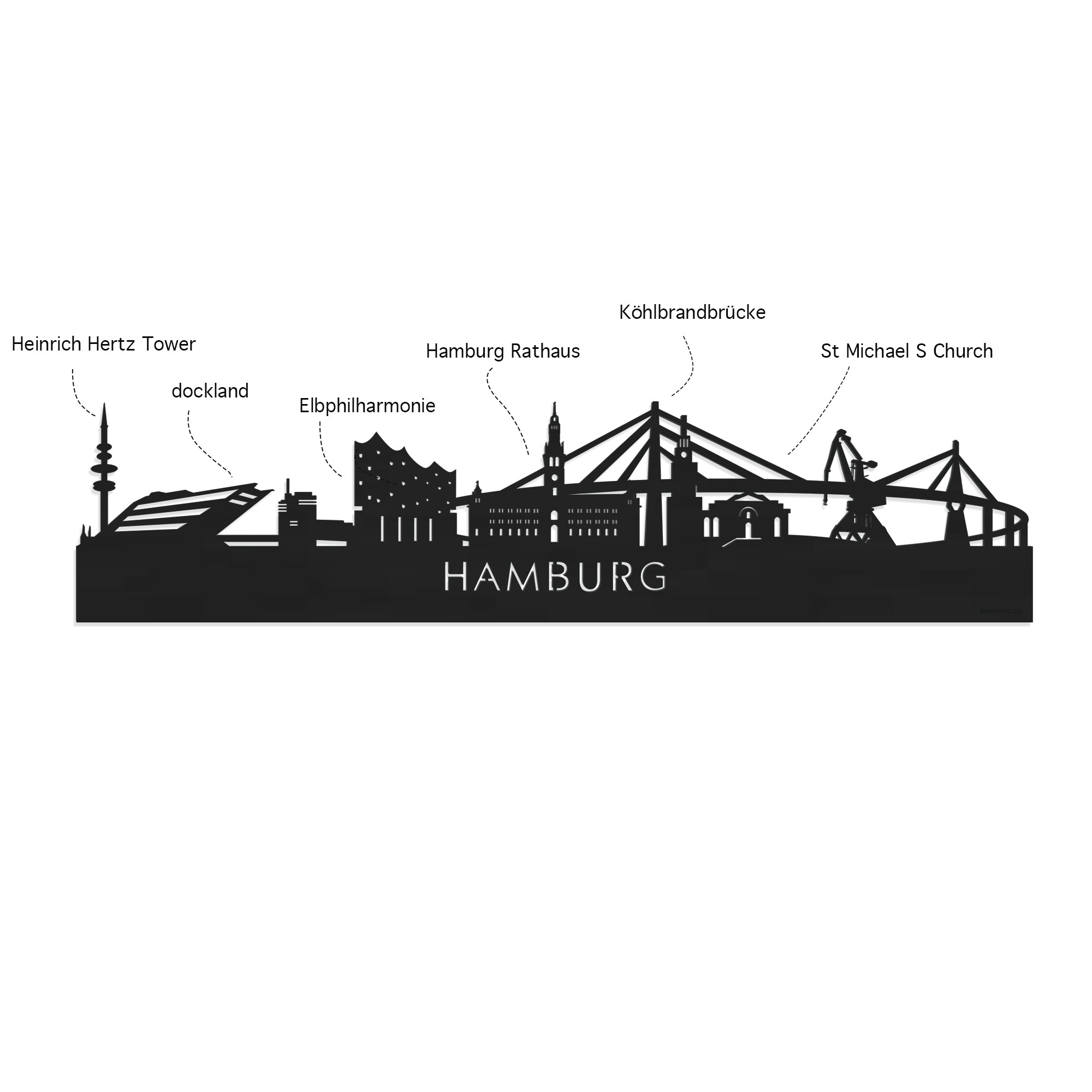 Je herkent ze vast allemaal; de hoogtepunten van deze mooie plaats Hamburg. De skyline is gemaakt in samenwerking met locals uit Hamburg. Je ziet Heinrich Hertz Tower, Dockland, Elbphilharmonie, Hamburg Rathaus, Köhlbrandbrücke, St Michael S. Kerk.