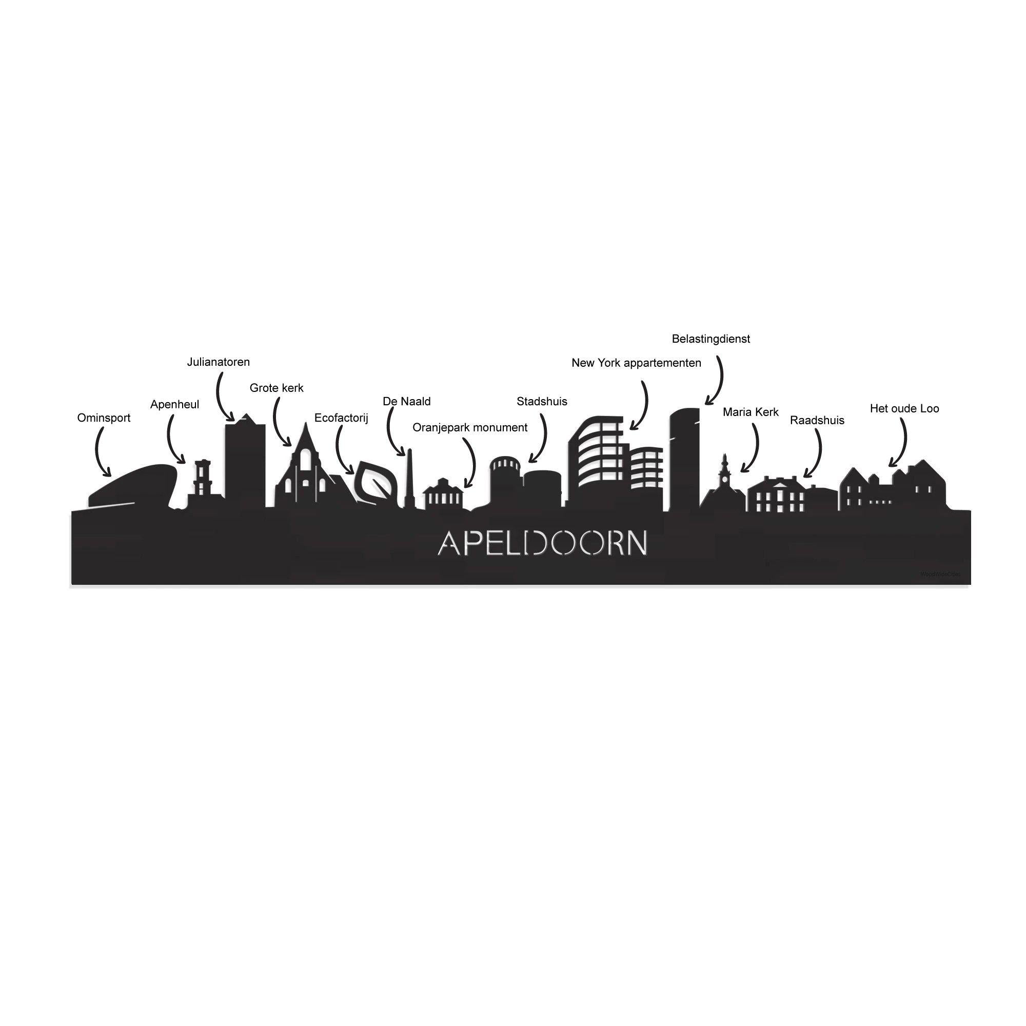 Je herkent ze vast allemaal; de hoogtepunten van deze geliefde plaats: Omnisport, Apenheul, Julianatoren, Grote Kerk, Ecofactorij, De Naald, Oranjepark monument, Stadshuis, New York appartementen, Belastingdienst, Maria Kerk, Het oude Loo. De skyline is gemaakt in samenwerking met Apeldoorn ondernemers en het silhouet komt uit het creatieve brein van een architect, dus alle verhoudingen kloppen.