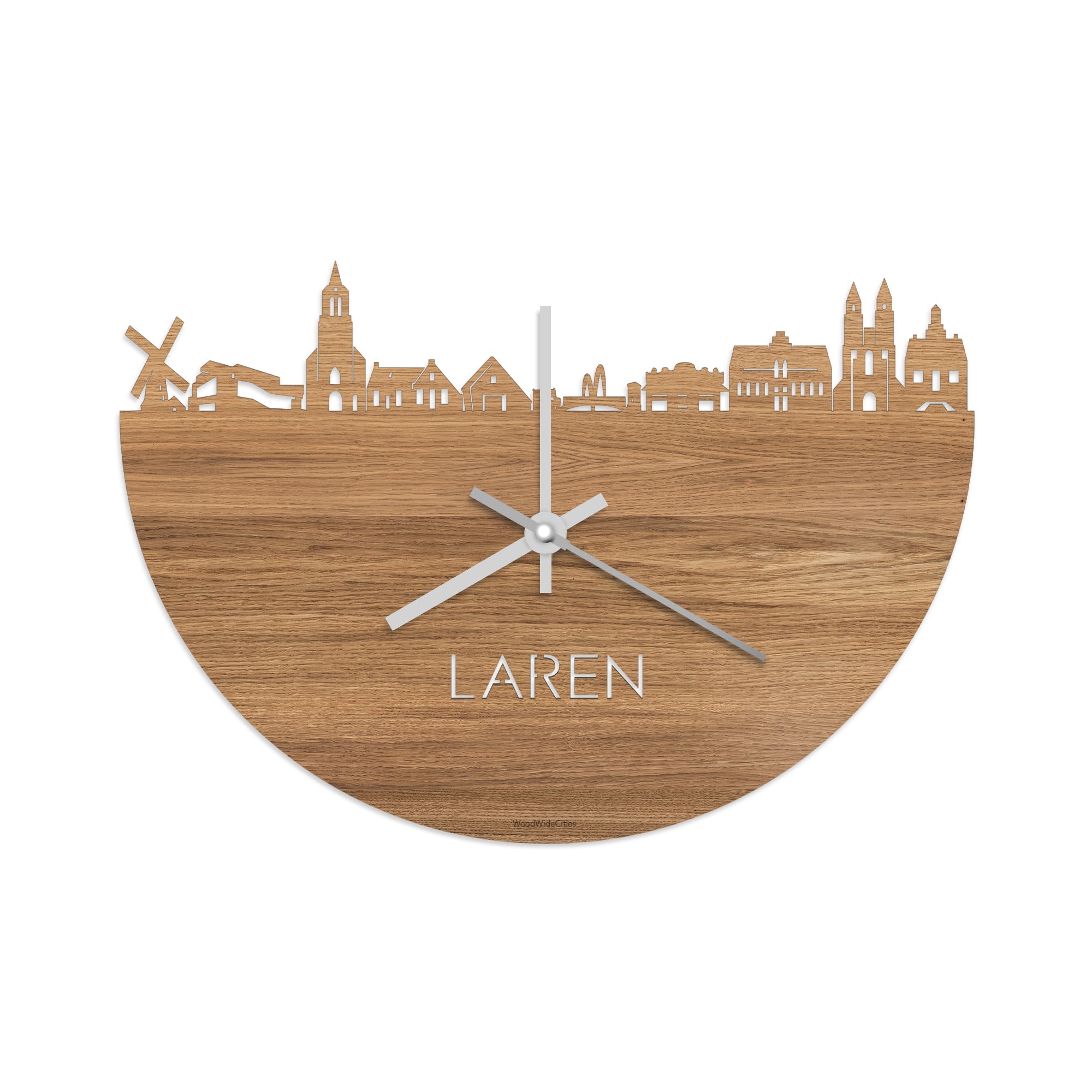 Time flies when you’re having fun! Dat geldt dubbelop als je deze multifunctionele houten Skyline Klok Laren Eiken in huis haalt. Deze klok met de skyline van Laren houdt je bij de tijd, maar neemt je ook mee terug naar de stad waar je bent geboren of waar je hebt gestudeerd. Een mooie herinnering, elke keer als je kijkt hoe laat het is! Of wat dacht je van een afscheidscadeau, een tijdloos geschenk voor moeder- of vaderdag en andere mijlpalen zoals trouwerijen, het behalen van diploma’s en het openen van een nieuw kantoor of bedrijf, een spetterende binnenkomer voor je kind die gaat studeren in een andere stad of een ideaal cadeau voor de housewarming van kennissen en vrienden.